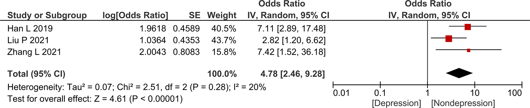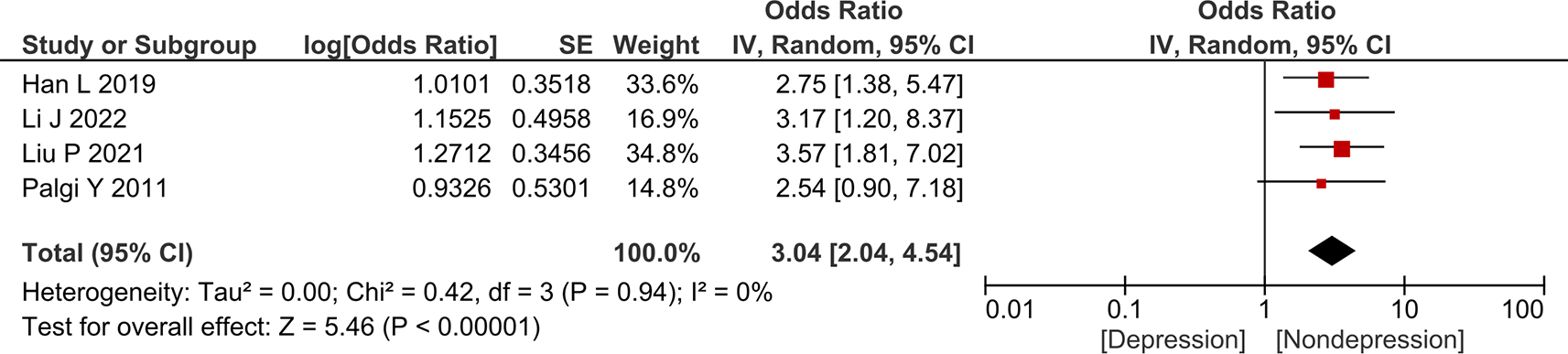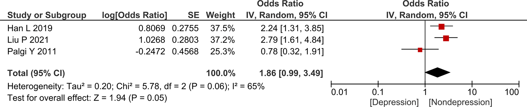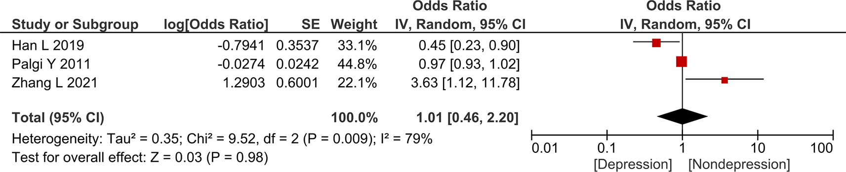 Figures 3–6 show the forest plot for the association between female sex, older age, diabetes mellitus, and higher cancer stage, respectively, with depression in gastric cancer. The result showed that female sex (aOR = 3.04; 95% CI 2.04–4.54) and diabetes mellitus (aOR = 4.78; 95% CI 2.46–9.28) were independently associated with higher odds of depression in gastric cancer. Meanwhile, older age (aOR = 1.01; 95% CI 0.46–2.20) and higher cancer stage (aOR = 1.86; 95% CI 0.99–3.49) were not independently associated with higher odds of depression in gastric cancer. Funnel plot and Egger’s test were not performed owing to the low number of studies in each forest plot.