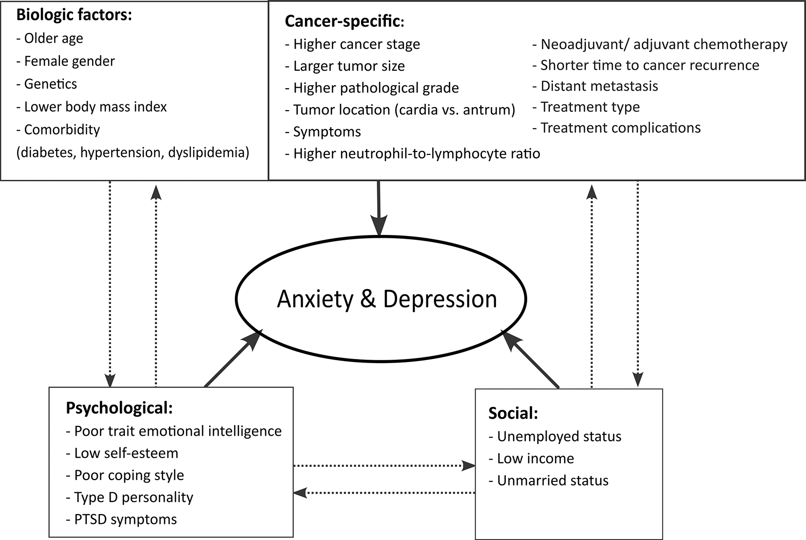 Fourteen studies were included in the review with a total number of 31,660 patients. From the included studies, we identified various risk factors that were significantly associated with anxiety or depression. We classified those risk factors based on Engel’s biopsychosocial model. Meta-analysis for eligible risk factors showed that female sex (adjusted OR = 3.04; 95% CI 2.04–4.54) and diabetes mellitus (adjusted OR = 4.78; 95% CI 2.46–9.28) were independently associated with higher odds of depression in gastric cancer. Furthermore, most studies showed that anxiety or depression was associated with worse survival in patients with gastric cancer.