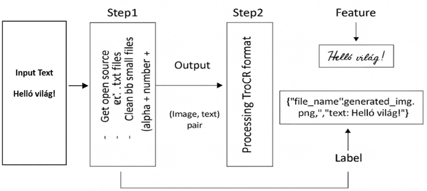 Table 1 there are some labeling issues where there are some special Hungarian letters not recognized (á,é,í,ö,ó,ő,ü,ú,ú,ű) for some utilized types of fonts. Figure 2 shows a sample algorithmic procedure for converting plain text into HTR data.