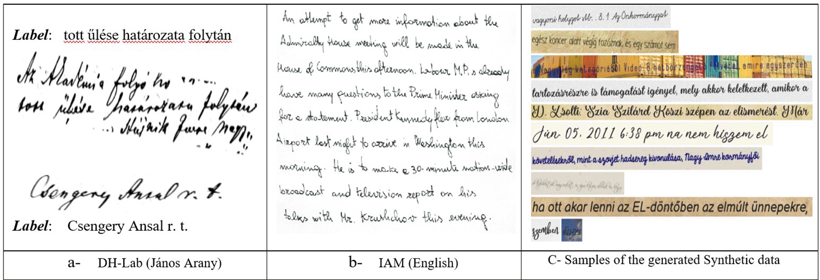Divergent results were obtained with a limited dataset due to the lack of a Hungarian human-annotated handwritten large dataset. Building on an existing tool for international languages to generate synthetic data.36 We used an open-source font by collecting approximately 200 font types37,38 based on Hungarian to present synthetic data. We published a 3M set of line-level (image, text) as part of this work by making them publicly available, Data for English and Hungarian was generated data using seven Hungarian versions with varying parameters for augmentation, including blur, Gaussian, distortion, rotation, color, uncolored text, noise, and skewing, with various background images, as shown in