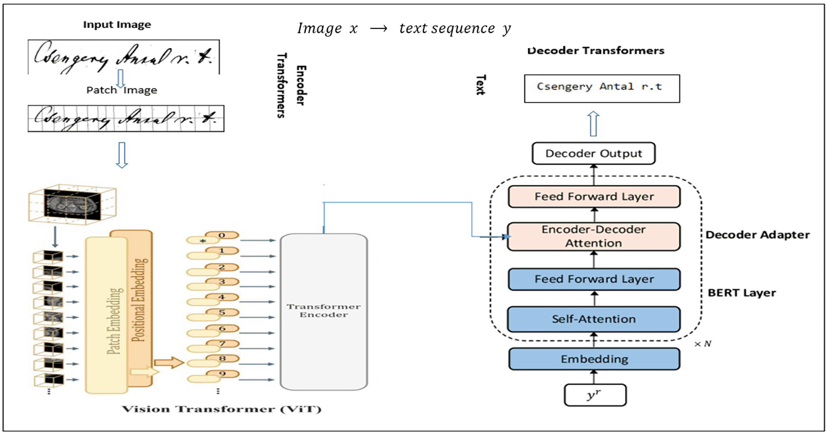 Sharing the parameters with the intended learners immediately is a straightforward technique for controlling these parameters. An image encoding module based on ViT and a sequence generation decoder based on transformers improved by language model features are assembled in Figure 5 to create a vision-to-text workflow for Hungarian handwritten text recognition. The handwritten text picture provided was first separated into patches in this process, and these patches were then embedded and enhanced with spatial data. The Vision Transformer encoder layers evaluate these embeddings, enabling the computational model to extract contextual and spatial characteristics using a script. The encoded visual representation is then fed into a transformer decoder, which uses encoder–decoder attention to associate the visual attributes with the produced text and self-attention layers to analyze previous output tokens to perform sequence modeling. Furthermore, BERT layers were added to the decoder to improve contextual knowledge, especially for materials in Hungarian. Text that had been broken down into tokens (words or subwords) was processed by BERT. Embeddings were generated using tokens. Self-attention is used through a transformer encoder for interpretation. BERT can comprehend word relationships and meanings by utilizing contextualized visualizations of the text. Ultimately, the decoder transforms the handwritten source into its digital format by generating an identified string. TrOCR is basically a ViT18 Encoder + Transformer Decoder trained for sequence-to-sequence (Seq2Seq) mapping: