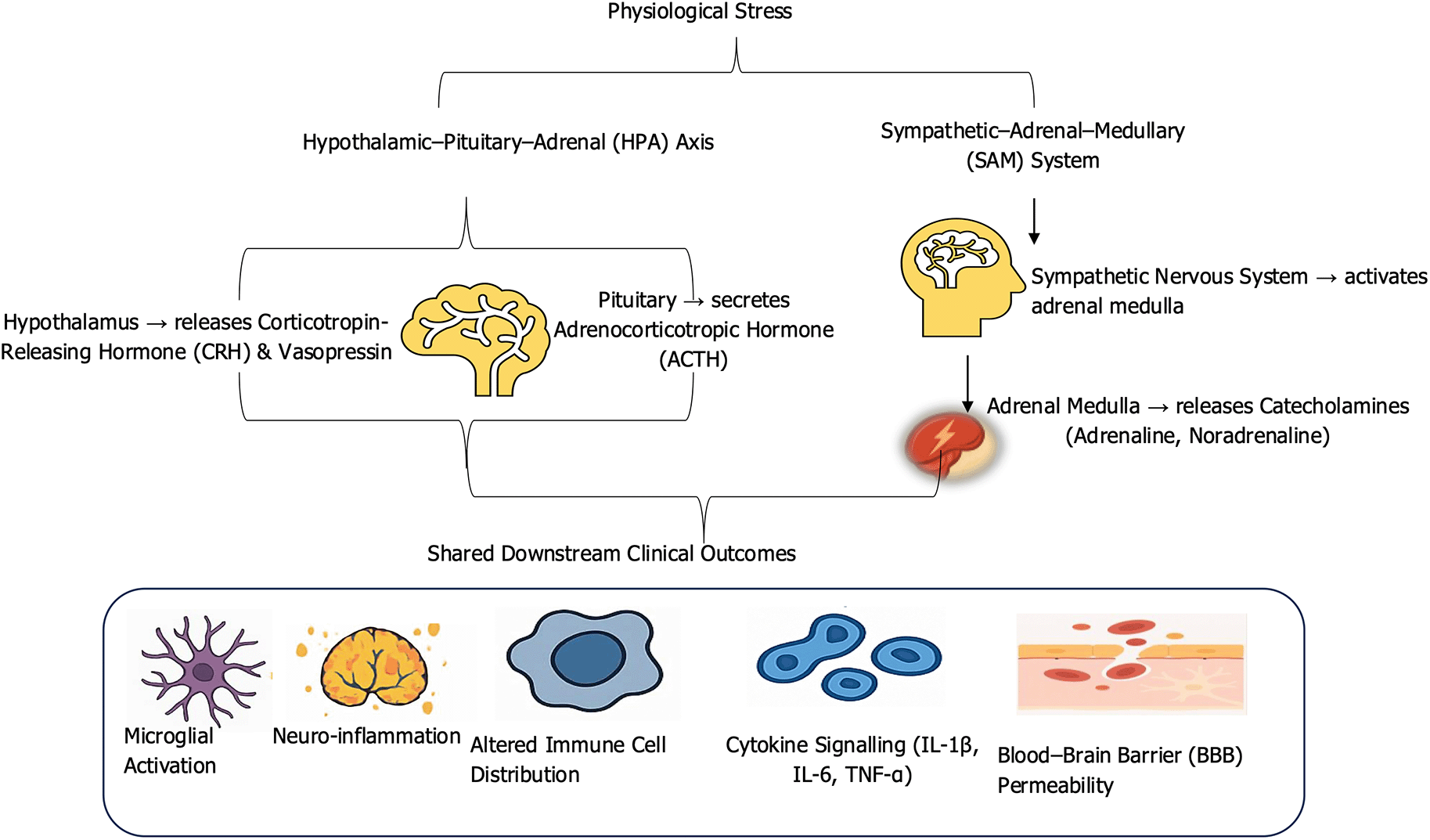 Stress is one of the most widespread health determinants globally, affecting an estimated 70-90% of adults at some point in their lives. Short-term stress can enhance survival by mobilizing energy and immune defenses, prolonged or chronic stress has been associated with poor health outcomes (Piao et al., 2024). According to the World Health Organization, stress-related mental disorders such as depression and anxiety affect more than 970 million people worldwide (Al-Garni et al., 2025). The economic burden of stress-related disorders is estimated to exceed US$1 trillion annually in lost productivity. Beyond mental health, chronic stress contributes to systemic diseases, including cardiovascular disease, diabetes, autoimmune disorders, and cancer, making it a major global public health concern. Stress responses are coordinated through neuroimmune interactions that link the brain and the immune system (Kavvadas et al., 2023). These interactions involve the hypothalamic-pituitary-adrenal (HPA) axis, the sympathetic-adrenal-medullary (SAM) system, and peripheral immune circuits. Collectively, they regulate the release of stress hormones such as cortisol and adrenaline, along with immune messengers like cytokines, to maintain homeostasis. However, sustained activation of these pathways has been reported to disrupt their regulatory functions (Mbiydzenyuy & Qulu, 2024). Elevated inflammatory cytokines such as IL-6, TNF-α, and IL-1β are observed in patients with major depressive disorder (MDD) and post-traumatic stress disorder (PTSD). This has been reported using positron emission tomography (PET) imaging, which consistently reveals glial activation in these populations (Min et al., 2023). In Alzheimer’s disease, chronic microglial activation contributes to impaired clearance of amyloid-β and accelerates neuronal degeneration (Min et al., 2023). Similar patterns are reported in Parkinson’s disease and other neurodegenerative conditions. Chronic stress-related inflammation increases the risk of coronary artery disease by 40% and is strongly linked to insulin resistance and metabolic syndrome (Valiukas et al., 2025). Despite progress, important research gaps remain why some individuals exposed to prolonged stress develop severe psychiatric or neurodegenerative disorders while others maintain resilience (James et al., 2023). The contribution of sex-specific biology, early-life adversity, and gut microbiome diversity to these outcomes is still poorly characterized. Moreover, although mechanistic studies have reported the roles of glucocorticoid receptor resistance, persistent cytokine signaling, and epigenetic modifications, translation into effective therapies has been limited (Beurel & Nemeroff, 2024). Biomarker-driven patient stratification, longitudinal studies, and integrative multi-omics approaches are urgently needed to bridge this gap. This review synthesizes current evidence on neuroimmune interactions in stress, focusing on physiological systems, molecular mechanisms, and health implications.