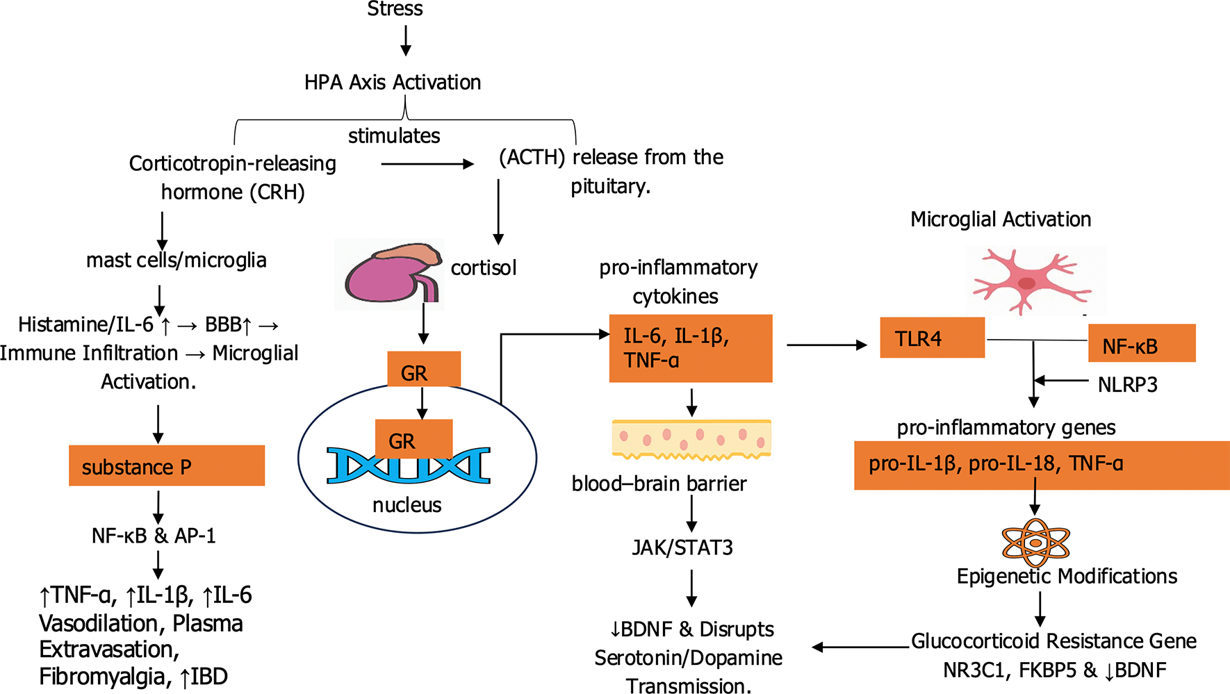 This figure illustrates how stress mediators activate both endocrine and immune pathways. Substance P and glucocorticoids act through glucocorticoid receptors to influence gene transcription, whereas immune activation via TLR4 and NF-κB signaling drives the release of pro-inflammatory cytokines, including IL-6, IL-1β, TNF-α, pro-IL-1β, and pro-IL-18. Together, these processes link stress to chronic neuroinflammation and altered neural activity.