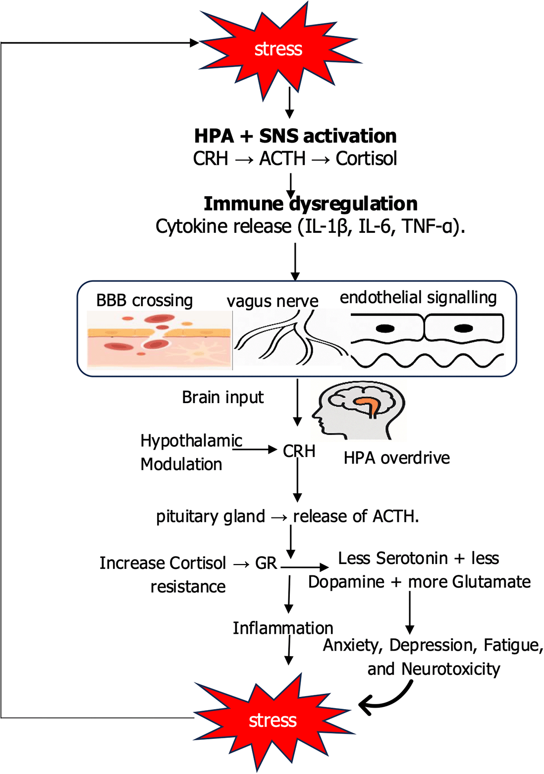 Cytokines form an important link between psychological stress and systemic inflammation through tightly regulated feedback loops. Acute stress activates HPA axis and SAM system, releasing cortisol and catecholamines. These hormones normally suppress excessive inflammation and restore balance. Under chronic or repeated stress, immune cells develop reduced sensitivity to glucocorticoids resulting to glucocorticoid resistance. This breakdown in negative feedback allows persistent production of pro-inflammatory cytokines, particularly interleukin-1β (IL-1β), interleukin-6 (IL-6), and tumor necrosis factor-α (TNF-α) (Auger et al., 2024). These cytokines can penetrate the blood–brain barrier via active transport or signal indirectly through endothelial and vagal pathways. Once within the central nervous system, they further stimulate the hypothalamus and brainstem, driving additional HPA and SAM activity (Krasner et al., 2025). The result is a self-repeating cycle in which stress hormones and cytokines reinforce one another. Adaptive in the short-term enhancing immune vigilance and energy mobilization this feedback becomes maladaptive when prolonged. Sustained cytokine activity maintains systemic inflammation, contributing to cardiovascular disease, metabolic syndrome, and neuropsychiatric disorders. These feedback loops as depicted in Figure 3 illustrate how stress responses, initially protective, can transform into amplifier of chronic disease (Valiukas et al., 2025).