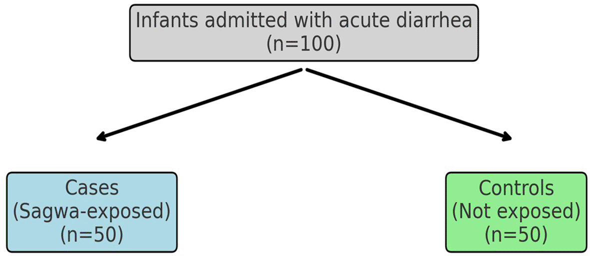 A prospective case-control study in Al-Fallujah, Iraq from July 1st, 2022, to Jan 1st, 2023. The participants were infants with acute diarrhea who were admitted to pediatric wards and emergency departments. The cases were those infants with diarrhea who have been given Sagwa. Controls were age- and sex-matched who had acute diarrhea without use of Sagwa. The data of patients included: the number of times of having Sagwa, the duration between exposure and hospital admission, duration of hospital stay, the grandmother responsibility, the severity of dehydration, the presence of renal failure, the need for dialysis, convulsion, coma and death.