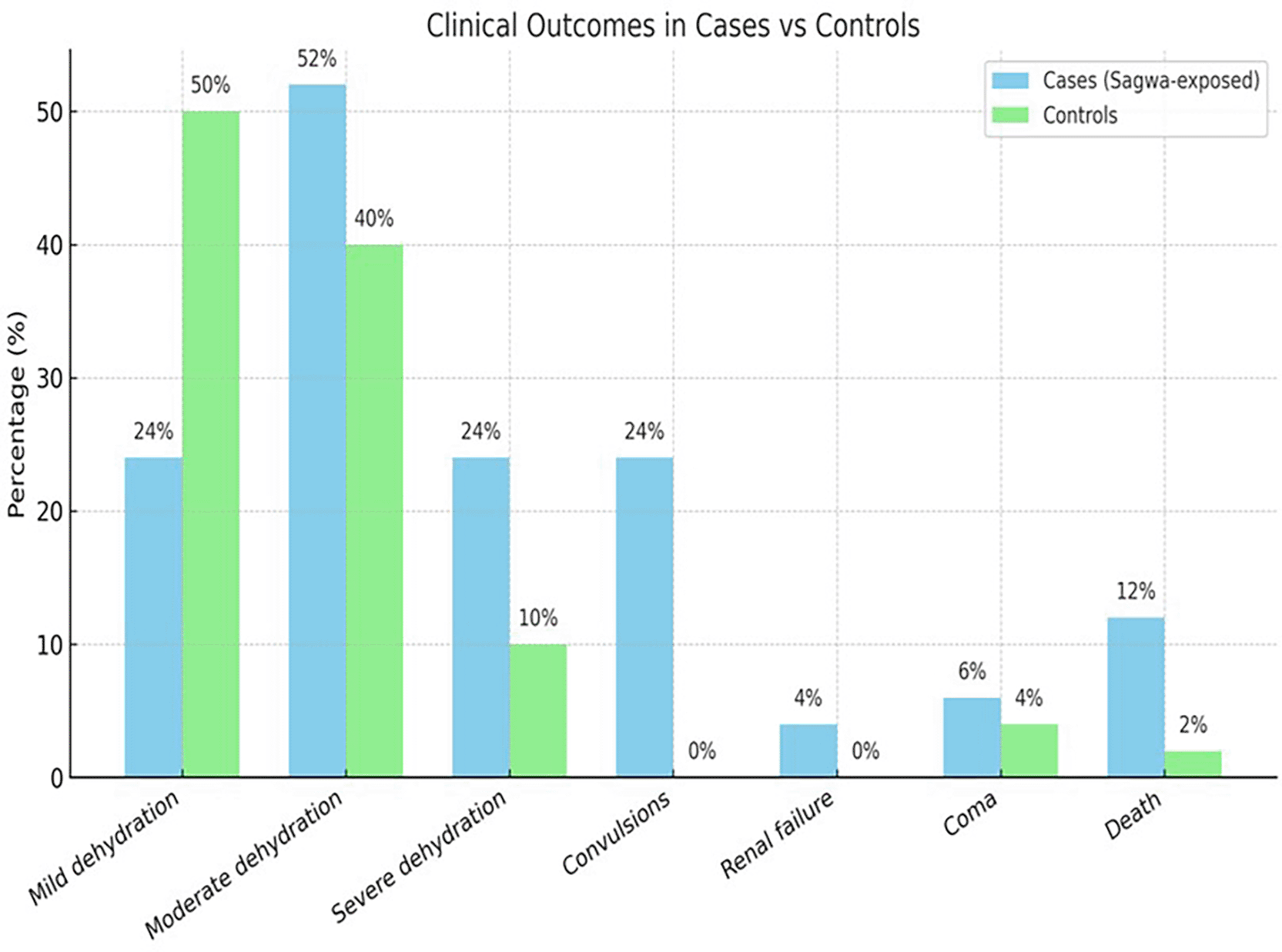 Regarding clinical outcomes, severe dehydration was significantly more common among cases compared with controls (p=0.01). Convulsions were strongly associated with Sagwa exposure, occurring only in cases (p<0.001). Mortality was also significantly higher among cases than controls (p=0.05). In contrast, no significant differences were noted between the two groups regarding renal failure (p=0.1), dialysis (p=0.3), or coma (p=0.6) ( Table 3). These contrasts in outcomes are summarized visually in Figure 2, which highlights higher rates of severe dehydration, convulsions, and mortality among cases.