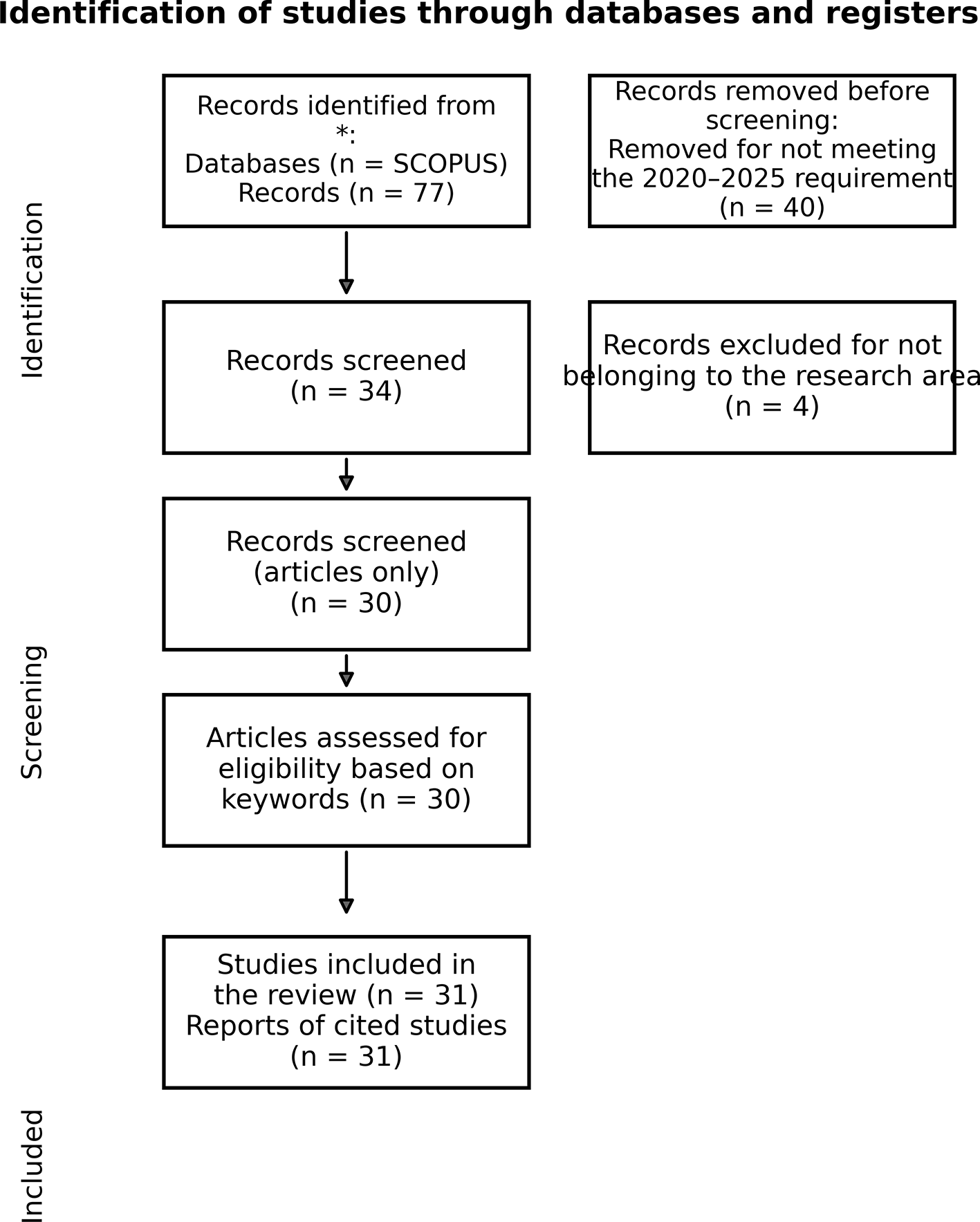 After filtering by publication year (2020–2025), 77 records were retrieved. Following inclusion criteria, 30 peer-reviewed journal articles were retained for analysis ( Figure 1).
