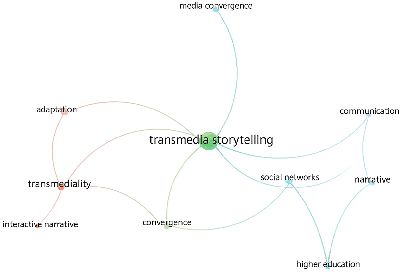 The bibliometric analysis using VOSviewer (2025) identified 514 keywords across 30 Scopus-indexed articles. Through co-occurrence analysis (96% confidence level; 4% margin of error), ten major conceptual categories emerged, reflecting the intellectual structure of transmedia storytelling research ( Figure 2).