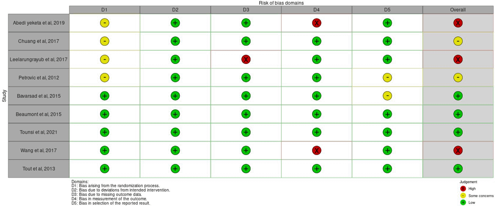 The Cochrane collaboration tool to assess the risk of bias for randomization control studies (Rob 2.0) was used for risk bias assessment. Two independent reviewers performed the assessment. The tool has five domains measuring: (1) bias arising from the randomization process, (2) bias due to deviation from intended interventions, (3) bias due to missing outcome data, (4) bias in the measurement of the outcome, and (5) bias in the selection of the reported results. Answers leadS to judgments of “low risk of bias” “some concerns,” or “high risk of bias.”