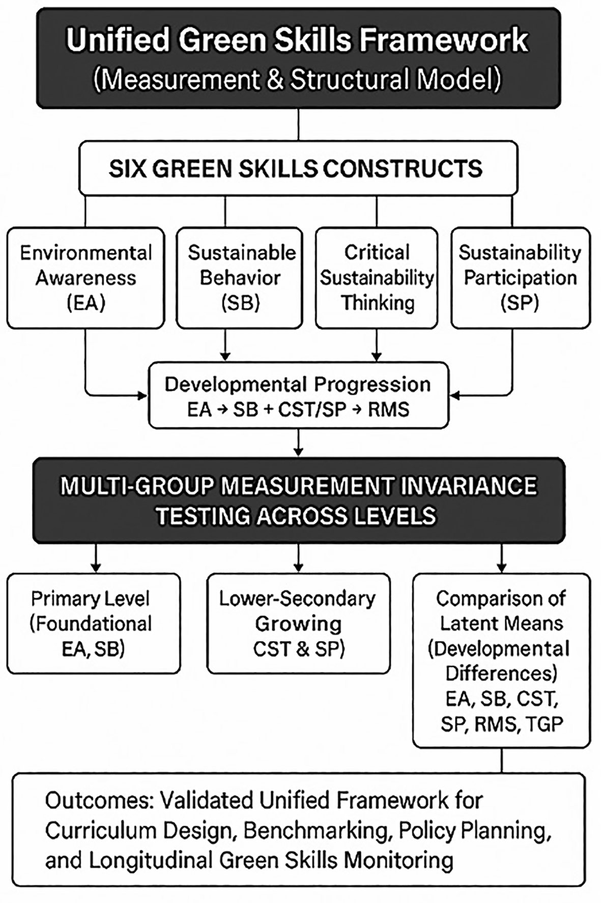 Given these challenges, there is a pressing need to construct and validate a unified measurement framework that assesses green skills consistently across educational levels. Such a framework must account for the developmental distinctions between basic, lower-secondary, and vocational learners while ensuring that core constructs remain conceptually and statistically comparable. Establishing measurement invariance across these levels not only enables valid comparisons but also provides empirical evidence for the continuity of green skills development within a national education system.