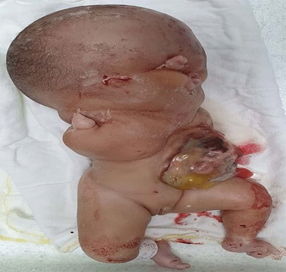 ⢠Very large cord cyst at the anterior wall of the trunk.