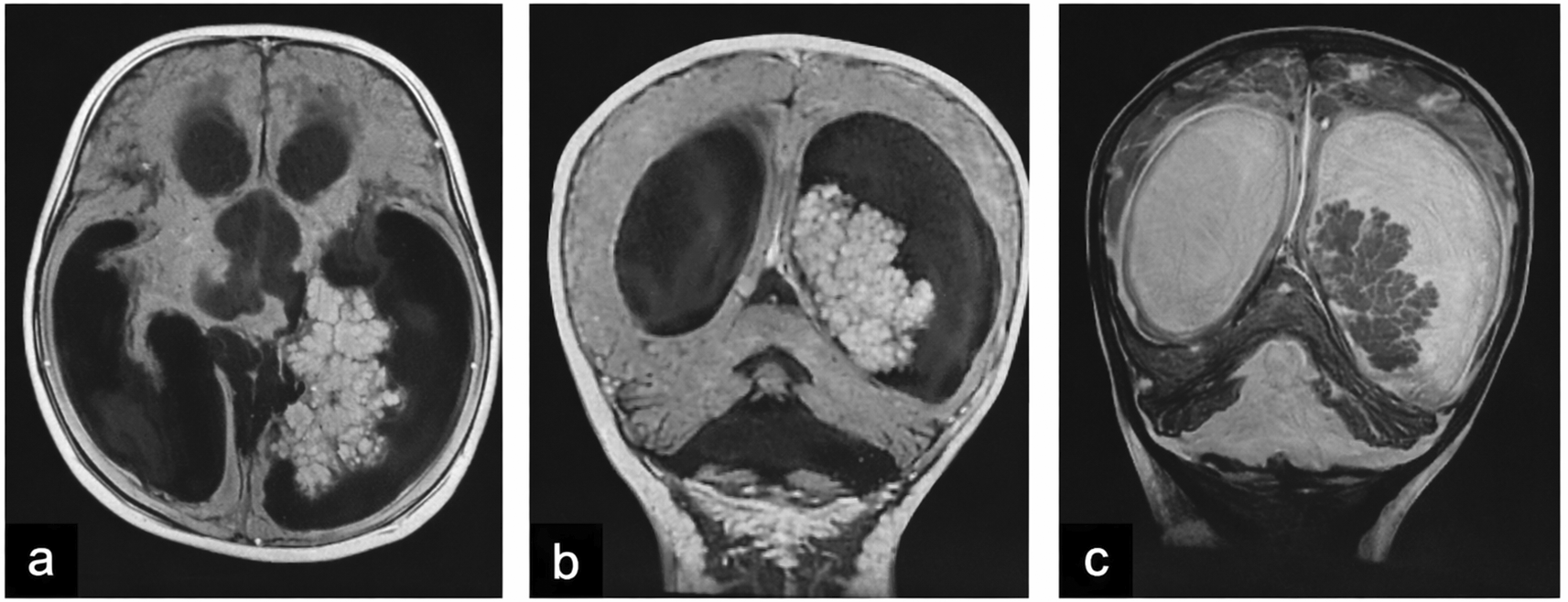 | 2 (CPP) | 2.8 F | Holocranial headache, projectile vomiting; clinically normal | Left occipital horn of the lateral ventricle, 5×4.7×3.8 cm, isodense, homogeneous enhancement, quadriventricular hydrocephalus (Figure 2) |