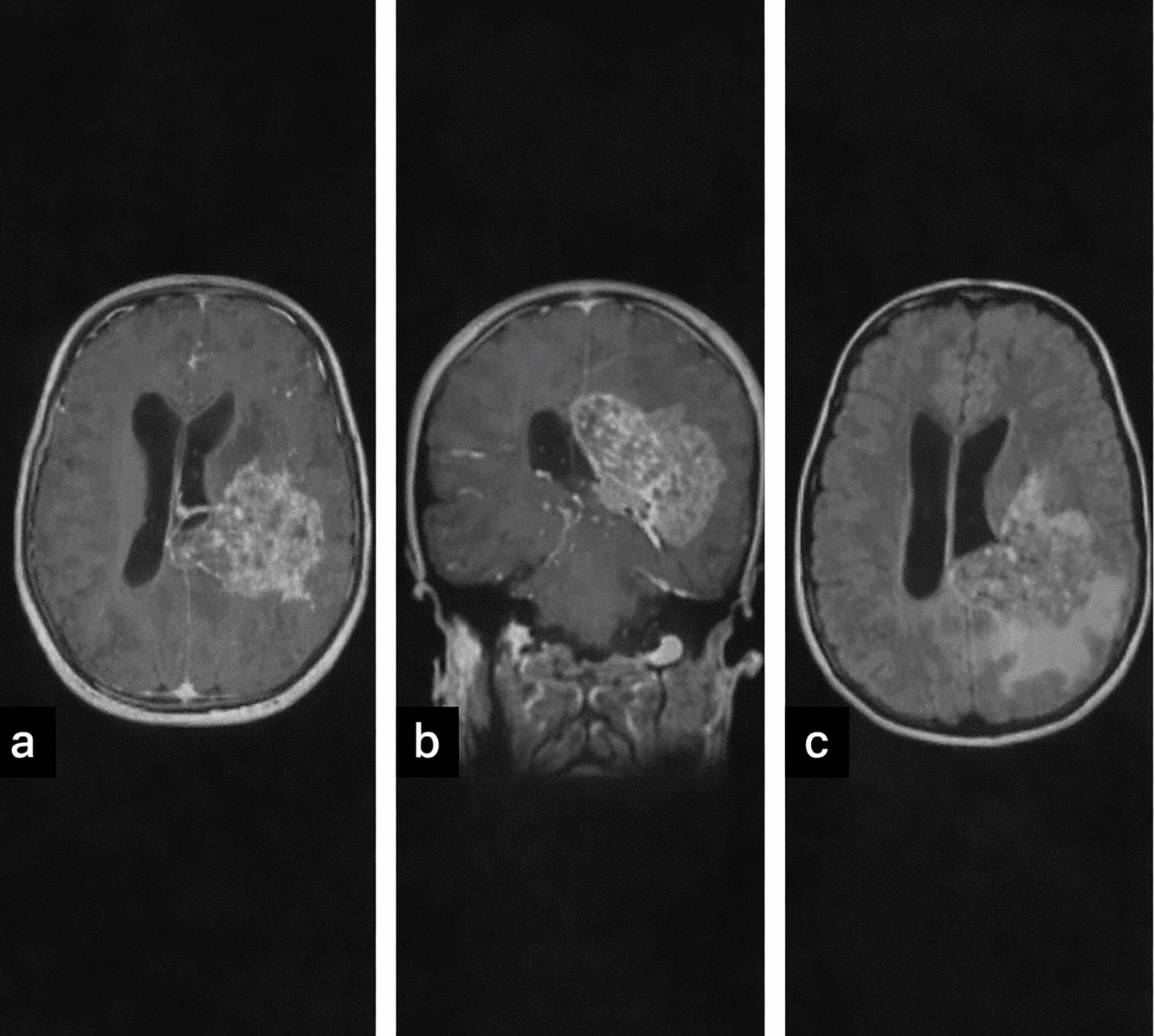 | 6 (CPC) | 3 M | Headache, vomiting, seizures; clinically normal | 11 cm solid lesion, heterogeneous enhancement, calcifications, marked mass effect |