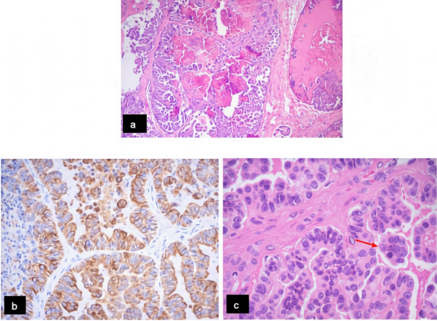 CPPs demonstrated typical papillary architecture with thin fibrovascular cores lined by monomorphic cuboidal epithelial cells, low cellularity, absence of necrosis, and no mitotic activity. CPCs exhibited high cellularity, nuclear pleomorphism, solid growth areas, frequent mitoses, and necrosis in two cases. Immunohistochemistry confirmed epithelial differentiation in all CPCs, with a Ki-67 index up to 40% in one case (Figure 4 and Table 2).