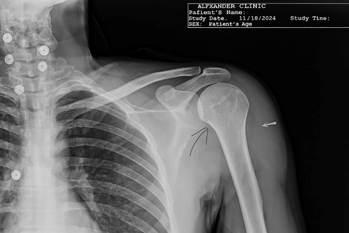 A 25 years old male patient presented to a private clinic in Fallujah city on 11/10/2024 with left shoulder pain and limitation of movement for 2 months. The forearm was clasped to his chest with inability to perform external rotation of the forearm. The patient had a history of electrical shock injury prior to his compliant.