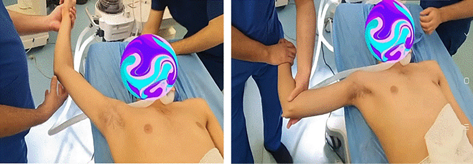 Under General Anesthesia, closed reduction successfully reduced the head with external rotation of the Humeral Head with a snap. Examination of shoulder joint movement under anesthesia revealed a full range of movements ( Figure 11).