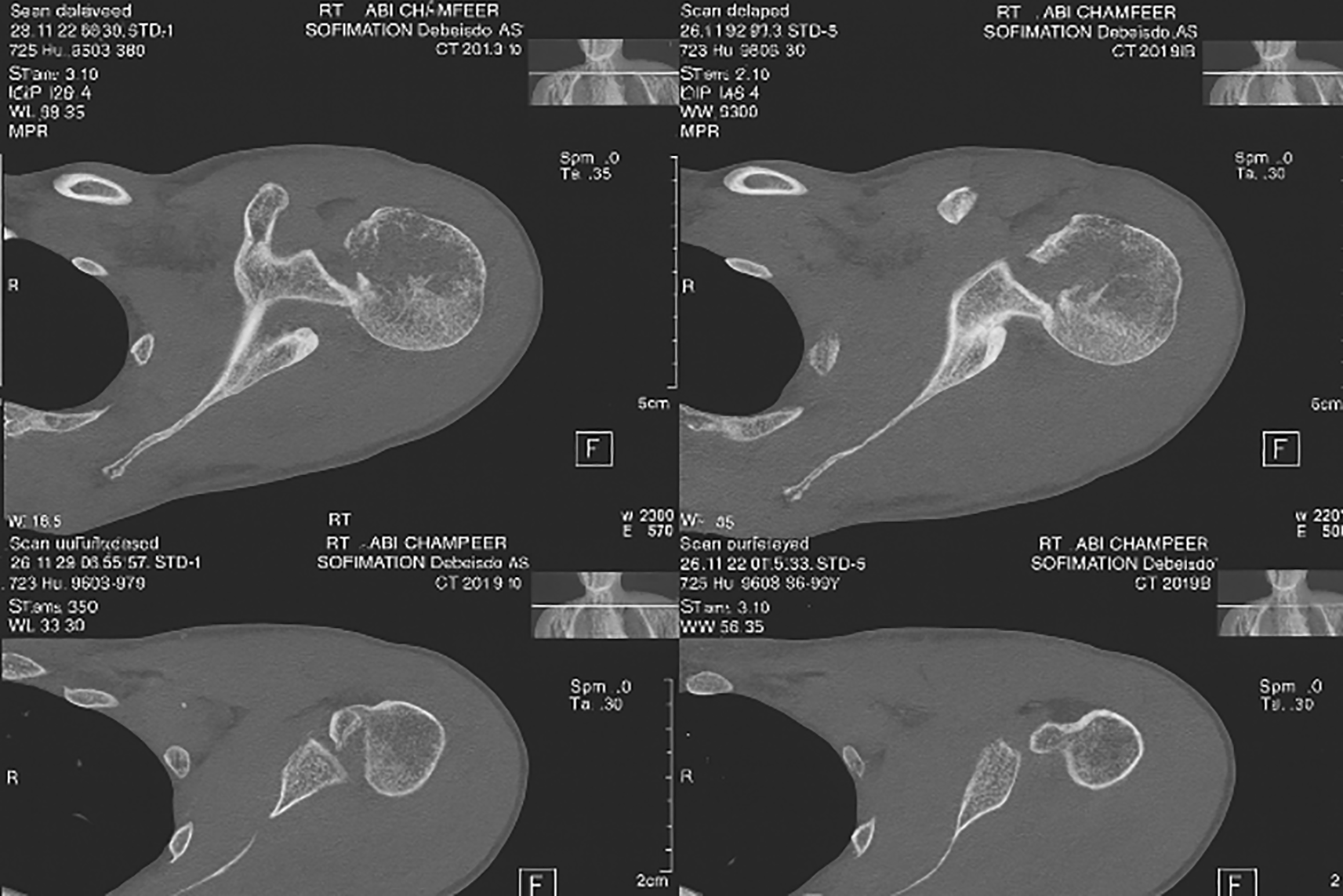 On examination, there was loss of external rotation movement of the shoulder. The X-rays showed a light-bulb appearance ( Figure 5). The CT scan: shows Reverse Hillsach lesion ( Figure 6).