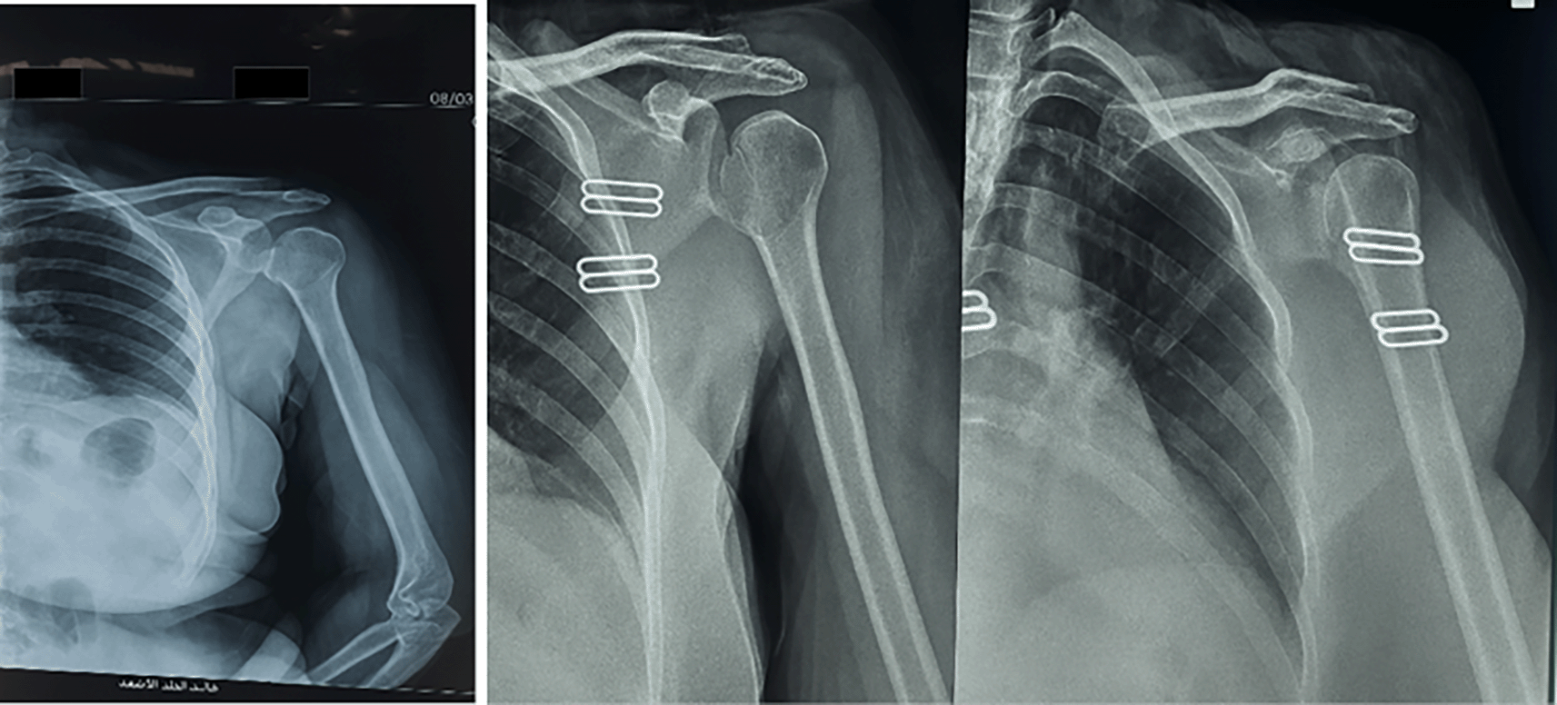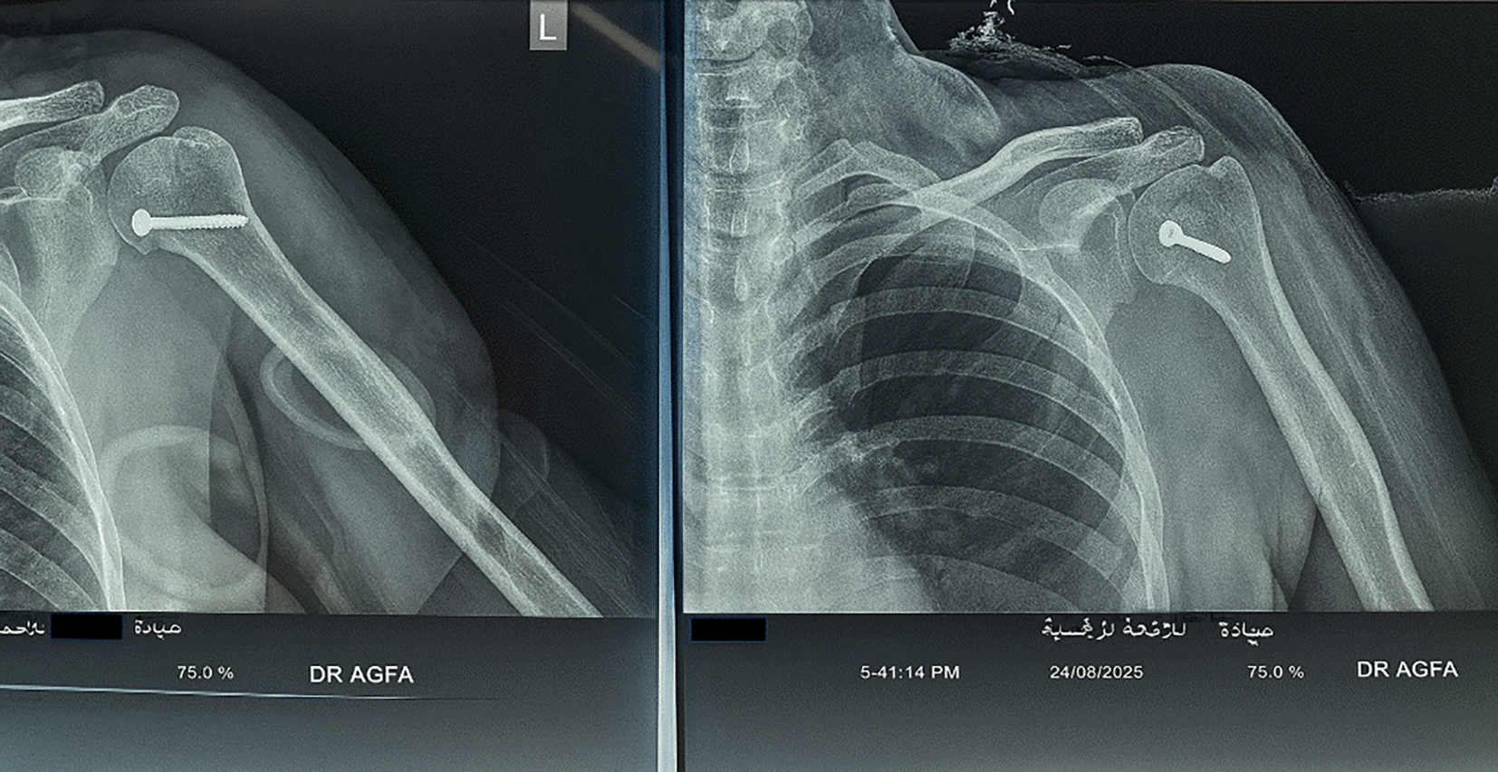 An 18 years old male patient presented to a private clinic in Fallujah city on 12/7/2025, with right shoulder pain and limitation of movement for 2 months. He had a history of falling, was admitted to the emergency department, and was told that he had a shoulder dislocation (there was no radiological document for his first dislocation). The patient underwent closed reduction (as he said), and later on, the patient still complained of limitation of movement of the right shoulder with severe pain and was admitted to a private clinic seeking relief.
