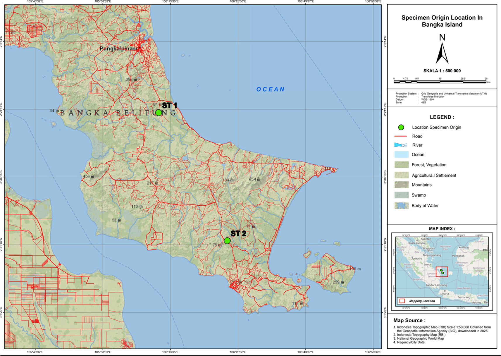 This study examines three endemic species of Betta: Betta burdigala, Betta chloropharynx, and Betta schalleri. The fish samples were collected from peatland water in South Bangka, Bangka Island, Indonesia. The map showing the origin locations of specimens on Bangka Island is presented in Figure 1. The males of B. schalleri and B. chlorpharynx have been found in Central Bangka (2°22'00.7"S 106°10'57.9"E) and B. burdigala has been found in South Bangka (2°50'24.8"S 106°26'12.7"E). The specimens were collected using a scope net with a mesh size of 0.5 mm as active gear. In-situ sampling data for morphometric and meristic analysis were obtained from three individuals each of B. schalerii, B. chloropharynx, and B. burdigala. The ten morphometric and seven meristic characters (Suppl Fig 1) based on Nur et al. (2022)2 were measured using a digital caliper with an accurary 0.1 mm. The sampling design in this study used purposive sampling based on mature females or males with different shapes and colors. Males have longer ventral fins than females.12 The males also have more vibrant and diverse body colors than females.13 The morphometric and meristic data were analyzed descriptively.