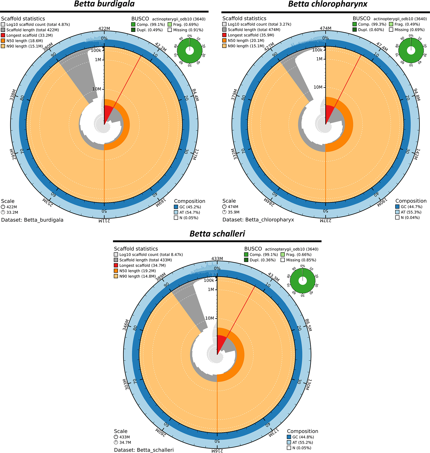 The genome assemblies of B. burdigala, B. schalleri, and B. chloropharynx demonstrated high contiguity and completeness, with B. chloropharynx showing the strongest contiguity, while B. burdigala and B. schalleri also provide high-quality genomic resources suitable for comparative and evolutionary studies ( Figure 3). The genome assembly of B. burdigala totaled ~422 Mbp across 4,868 scaffolds and 6,904 contigs, with a scaffold N50 of 18 Mb and the longest scaffold reaching 33.2 Mb. The assembly was highly complete, with a BUSCO score of 99.1% (98.6% single-copy, 0.5% duplicated), while the GC content was 45.2% and gaps accounted for only 0.048%. The B. chloropharynx genome was slightly larger at ~474 Mbp, assembled into 3,273 scaffolds and 4,918 contigs. It showed the greatest contiguity, with a scaffold N50 of 20 Mbp, a maximum scaffold length of 35.9 Mbp, and the highest mean scaffold length (~145 kb). BUSCO completeness reached 99.3% (98.7% single-copy, 0.6% duplicated), the highest among the three species, with minimal fragmentation (0.5%) and missing genes (0.2%). The Betta schalleri assembly spanned ~433 Mbp with 8,474 scaffolds and 10,762 contigs, reflecting greater fragmentation. The scaffold N50 was 19 Mb, with the longest scaffold at 34.7 Mbp and a mean length of ~51 kb. BUSCO assessment indicated 99.1% completeness (98.8% single-copy, 0.4% duplicated), with GC content at 44.8% and low gap content (0.053%).
