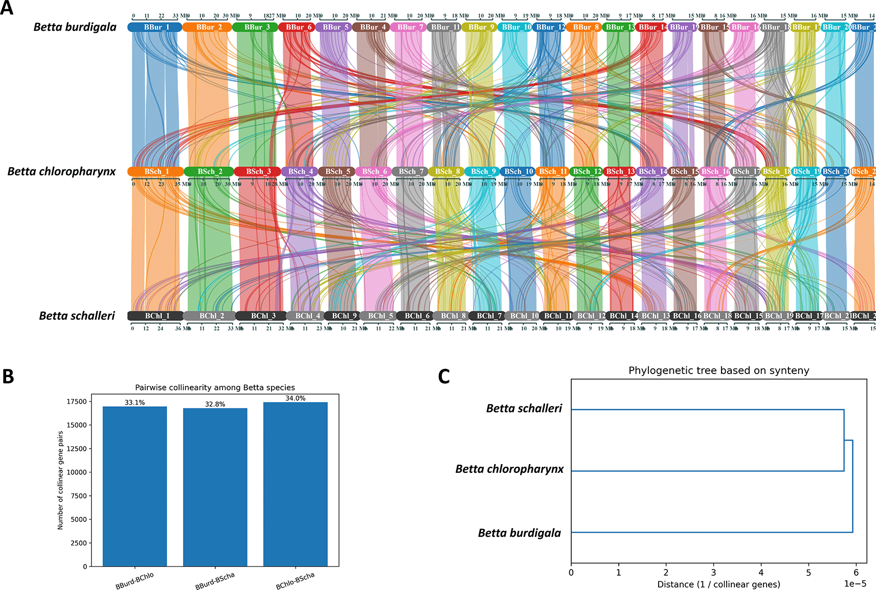 (A) syntenic block connection of the three genomes. (B) Pairwise collinearity among Betta species. (C) Pylogenetic tree based on synteny.