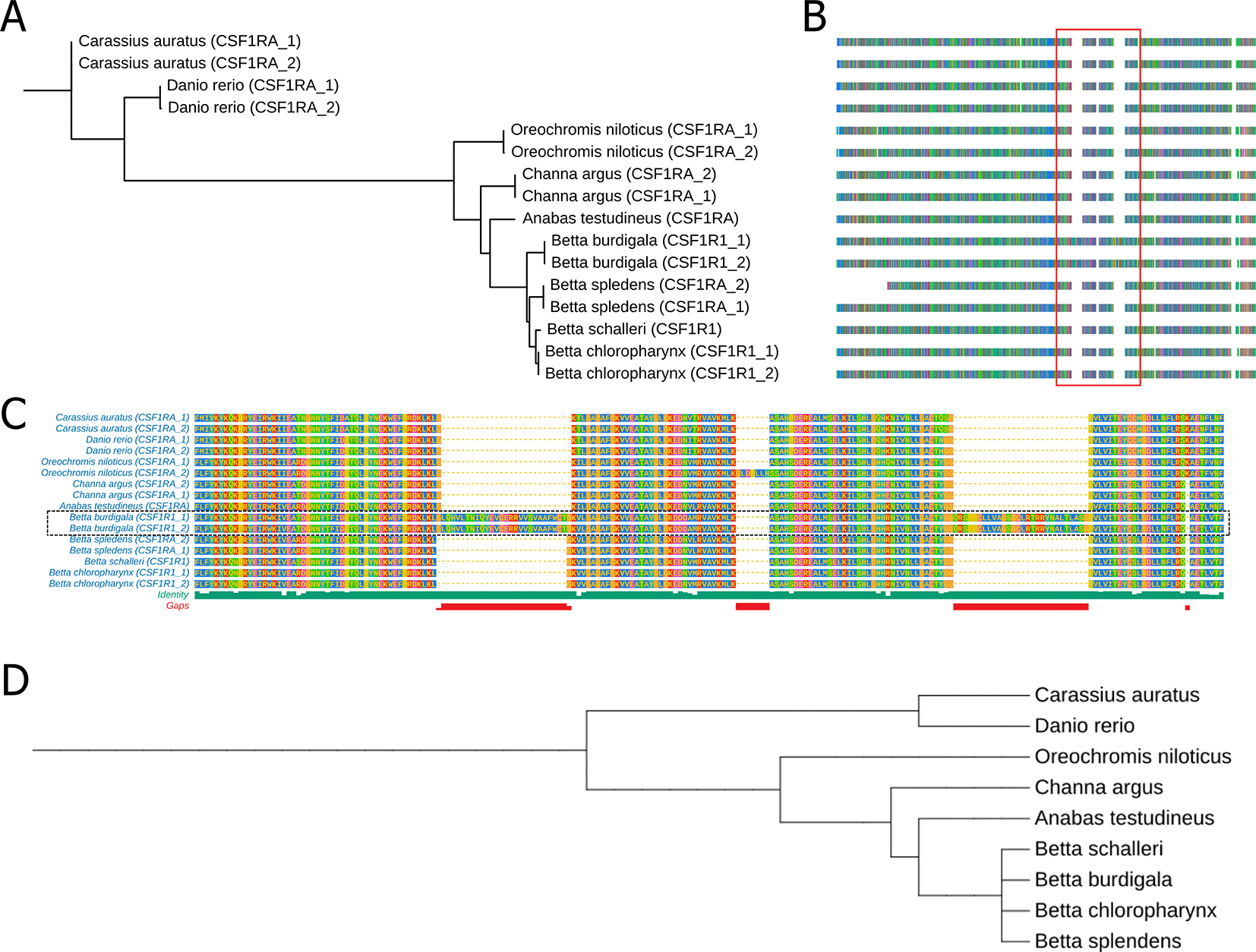(A) A phylogenetic tree derived from CSFRA protein alignments across nine fish species. (B) Multiple Sequence Alignment of the CSFRA protein in these nine fish species. (C) A zoomed-in view of the sequence alignment within the red line box in (B). (D) a phylogenetic tree of nine fish species based on NCBI taxonomic data. The complete protein sequence alignment of CSF1RA is available in Supplementary file 1.