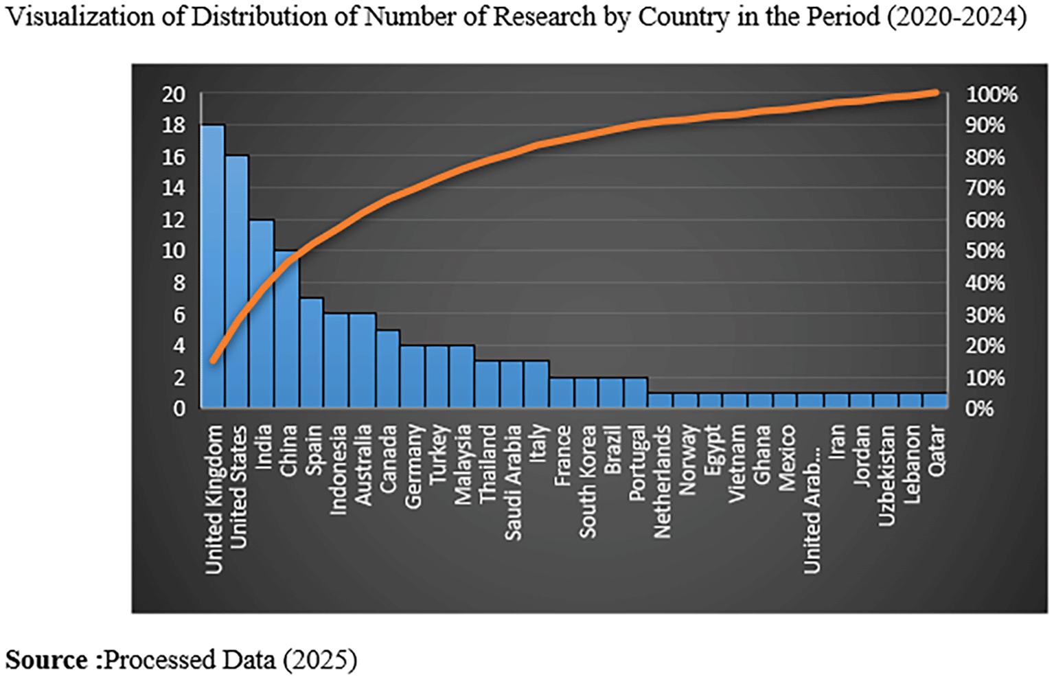 Visualization of distribution of number of research by country in the period (2020-2024).
