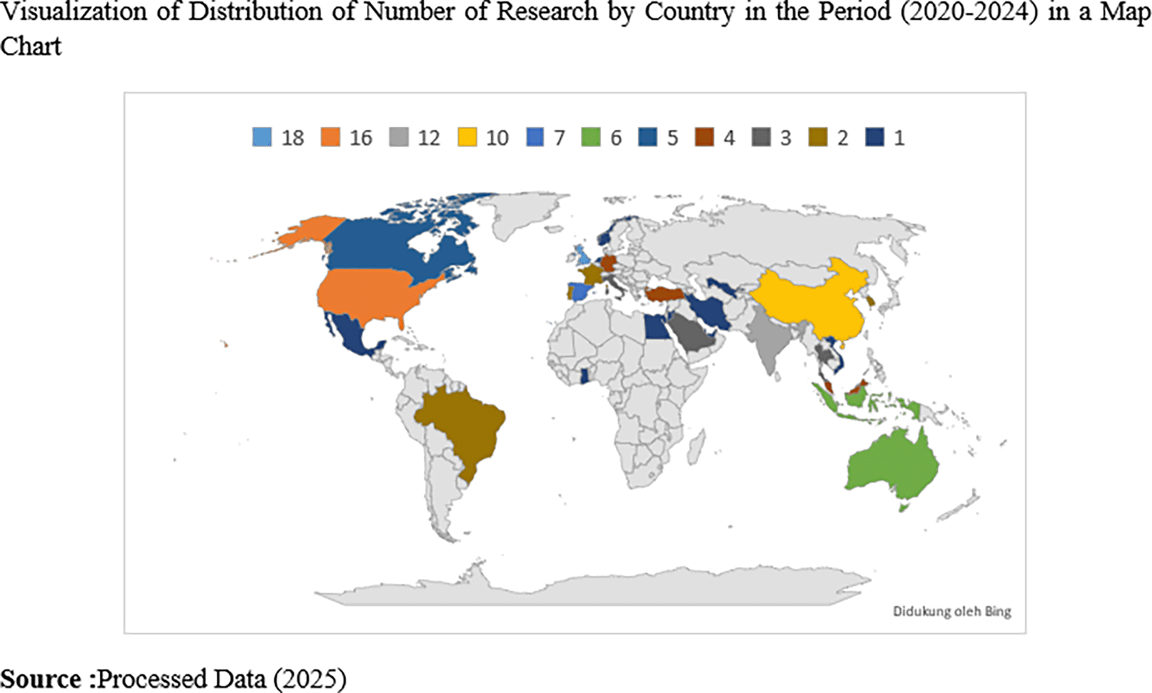 Visualization of distribution of number of research by country in the period (2020-2024) in a map chart.