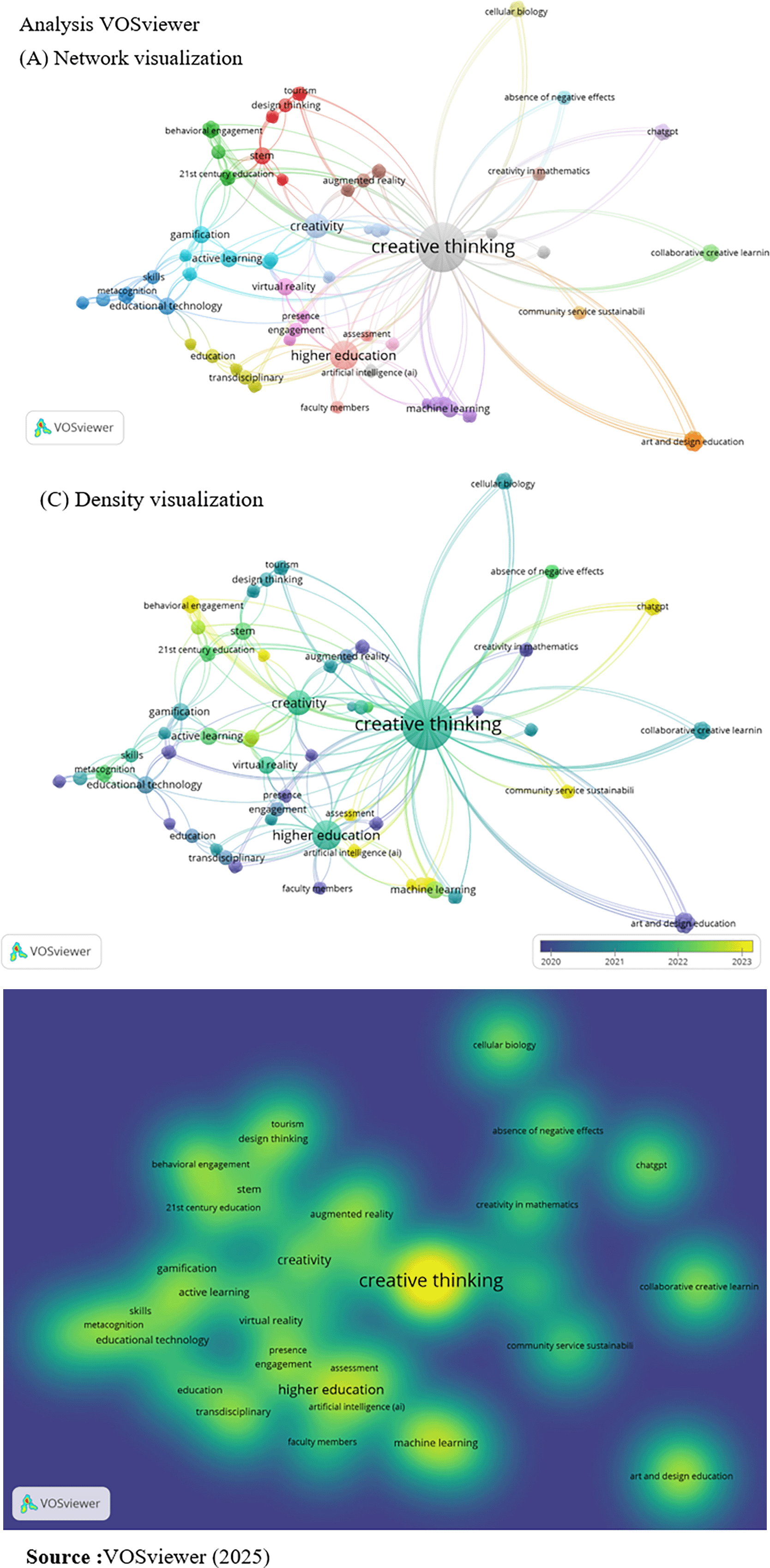 Figure 6 presents the analysis results from VOSviewer in three visualizations: (A) Network Visualization, (B) Overlay Visualization, and (C) Density Visualization. In the network visualization (A), the term “creative thinking” appears to be the dominant term, connected to various other keywords such as “higher education,” “creativity,” “educational technology,” “design thinking,” and “machine learning.” This pattern indicates that the discourse on creative thinking in higher education does not stand alone but is closely related to transdisciplinary approaches and the integration of modern technology. This visualization aligns with research findings (Alt, 2020) which emphasize that developing creativity in 21st-century learning involves cross-theme connectivity and digitally integrated pedagogical innovation. The interconnectedness of these keywords also indicates that creative pathways in strengthening scientific literacy in higher education tend to be complex and multidimensional.