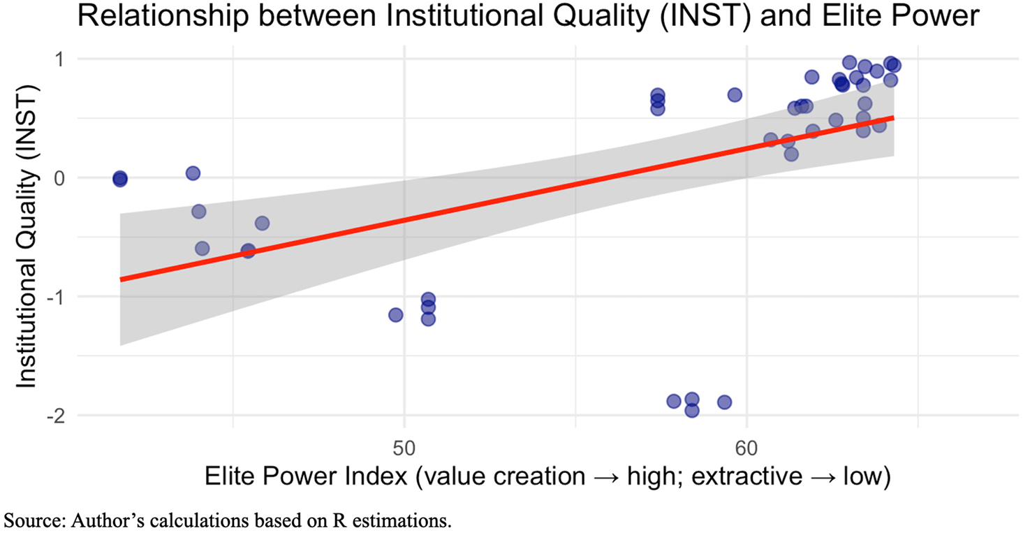 Figure 1 shows the scatter plot displaying the association between the Elite Power Index and Institutional Quality (INST) across all available countries. Higher values of the Elite index indicate more productive, value-creating elites, whereas lower values reflect more extractive elite structures. The positive slope of the fitted regression line (in red) suggests that, in this sample, countries with more value-oriented elites tend to exhibit stronger institutional quality.