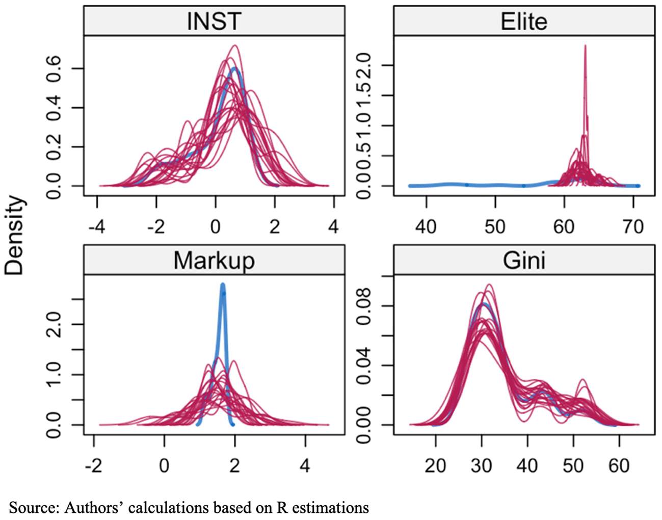 The dependent variable is a composite index of institutional quality (INST). Key explanatory variables include: (1) an indicator of elite power (Elite), measuring the concentration of political-economic influence; (2) an average profit margin indicator (Markup), an inverse proxy for market competition (higher markups imply less competition and potential market power); (3) the logarithm of real GDP per capita, as a measure of economic development; and (4) the Gini coefficient, as an indicator of income inequality. The selection of these 22 countries, beyond data availability, is crucial for examining the impact of institutional quality on economic outcomes, as it enables us to distinguish between countries with strong institutional frameworks and those with weaker ones (