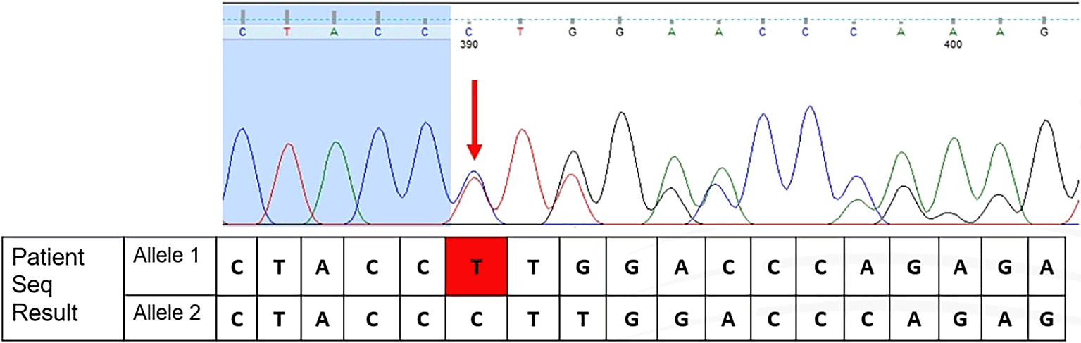 The term of “rare” in a genetic variant is defined as a variant that is not commonly discovered in a specific population. According to the results of Sanger Sequencing, there are nucleotide changes that lead to frameshifts in nucleotide reads, as shown in Figure 1. This novel variant showed changes in the coding sequence (CDS) position of 110. Changes in nucleotides are deletions of cytosine and frameshift of thymine, located immediately after the nucleotide at position 110 (HGVS: c.110delC; p.(Pro37Leufs*23)). This also caused frameshift nucleotide reads in the rest of the sequencing results. These changes manifested in amino acid changes from proline at position 37 to leucine, and a premature stop codon occurred after 23 amino acid translations. The classification of all variants reported, including this frameshift variant, was based on the American College of Medical Genetics and Genomics (ACMG) and the Association for Molecular Pathology.16