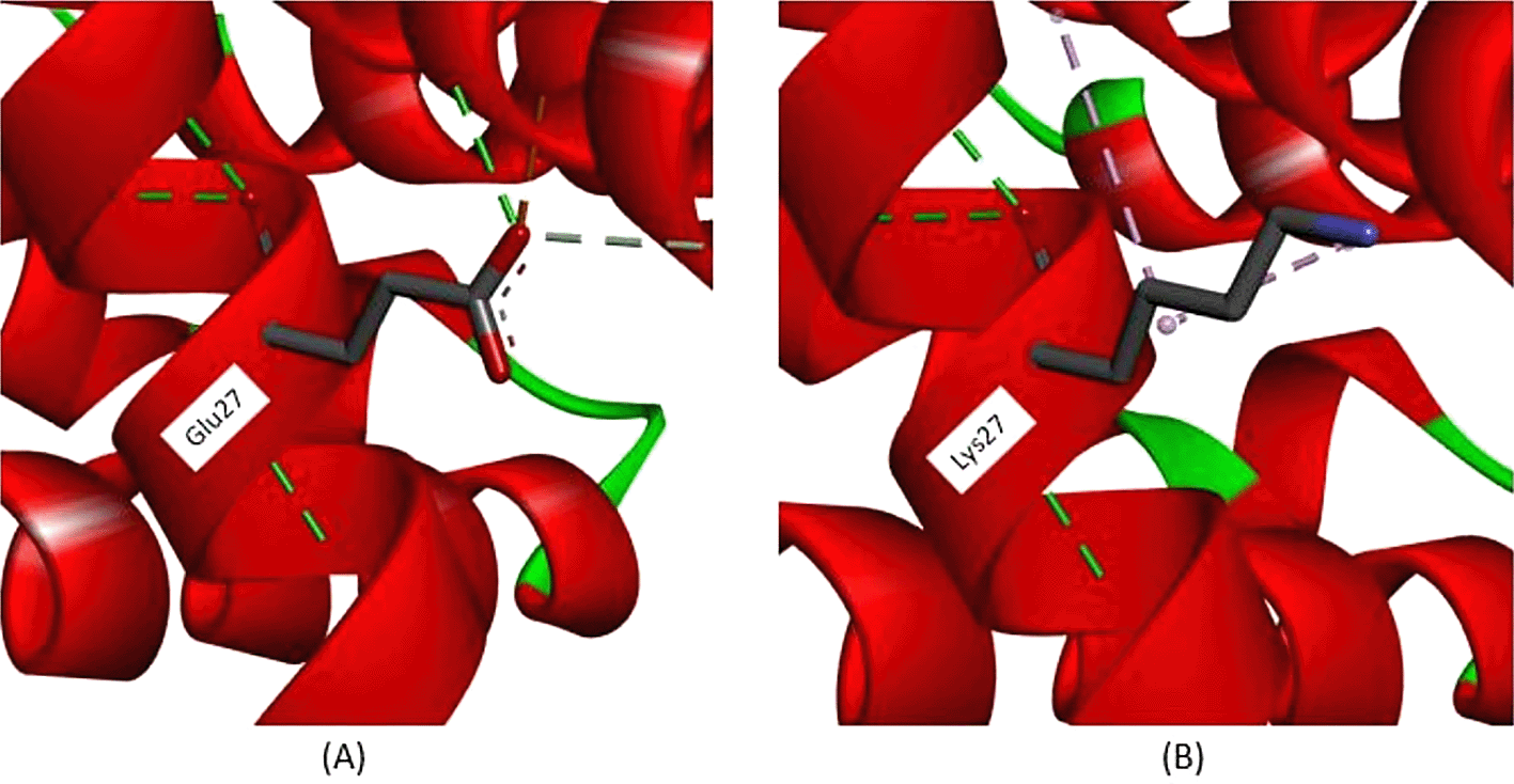 All exonic variants found in this study lead to amino acid changes that affect their interactions. According to Figure 3, a variant occurs in c.79, with nucleotide changes from guanine (G) to adenine (A), leading to an amino acid change at position 27. The amino acid change from glutamine (Glu) to lysine (Lys) is predicted to disrupt hemoglobin function. According to the analysis depicted in Figure 3A, in normal protein translation, glutamine at position 27 has a conventional hydrogen bond with Glycine30 (3.36 Å), Arginine31 (2.85 Å), and Glutamine23 (2.95 Å), as shown by the green dotted line. The carbon-hydrogen bond is also present between Glutamine27 and Histidine117 (3.55 Å), as indicated by the grey dotted line. An important interaction is the salt-bridge interaction between Glutamine27 and Arginine31 (2.71 Å), shown with a brown dotted line. Salt-bridge interactions are known to maintain this protein in equilibrium. While the variant Cd26 (HGVS: c.79G>A) led to a change from Glutamine27 to Lysine27, this structure is depicted in Figure 3B. Conventional hydrogen bonds remain; however, there are no salt-bridge interactions. The salt-bridge interaction changes to an alkyl interaction between Lysine27 and Arginine31 (5.31 Å) and Lysine27 and Valine114 (4.15 Å), as indicated by the pink dotted line. Loss of salt-bridge interactions causes an imbalance in protein structure.