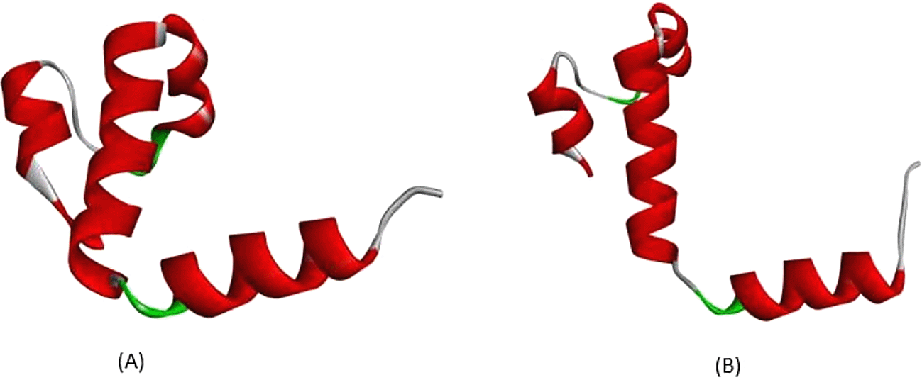 One frameshift variant (common name Cd41/42 (HGVS: c.126_129delCTTT)) leads to amino acid changes from proline at position 42 to leucine, and a premature termination codon occurs after translation of 17 amino acids, as depicted in Figure 5A. This frameshift variant produced a shorter protein product, which is in accordance with the severity of the subject. A rare variant observed in this study was c.110delC, which led to an amino acid change from proline at position 37 to leucine, followed by a premature stop codon after 23 amino acid translations. According to the analysis depicted in Figure 5B, genetic variations shortened the end-protein product. This strengthens the prediction that frameshift variants greatly influence overall protein structure, interactions, and bonds. In addition, the subject's clinical condition matched all variants found in this study.
