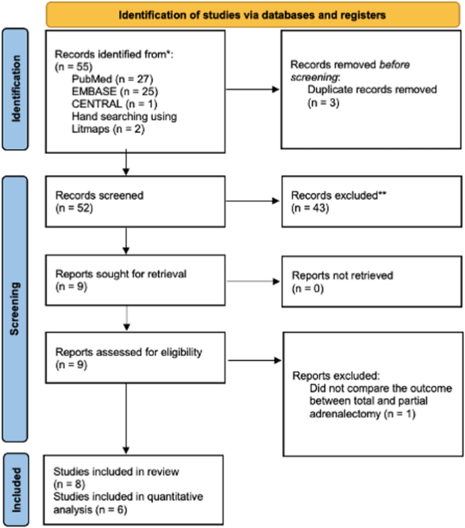 A total of 55 studies were identified from the three databases and manually searched using Litmaps (https://www.litmaps.com/). Three duplicate articles were excluded from analysis. After title and abstract screening, 43 articles were excluded, leaving 9 articles for full-text screening. After full-text screening, one article was excluded because it did not compare partial and total adrenalectomies. The study selection process, following the PRISMA flowchart, is shown in Figure 1.