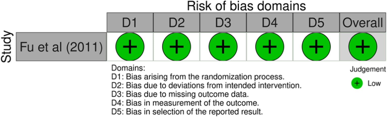 Based on ROBINS-1, four studies yielded low bias and three studies yielded moderate bias. Sources of bias were identified as selection bias, missing data, and measurement of outcomes, as shown in Figure 8. Based on the RoB 2.0, the study yielded a low risk of bias, as shown in Figure 9.