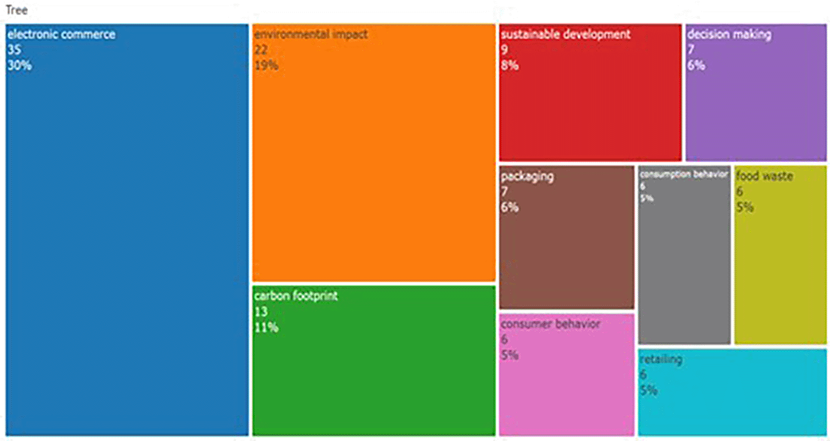 The tree map represents research topics from to 2014-2024 highlighting keywords related to e-commerce and sustainability. As can be seen in Figure 3, e-commerce has been a dominant theme, highlighting its importance and coverage in the last decade. The tree map also highlights research areas such as carbon footprint, “sustainable development,” and “packaging”, which further suggests the emphasis of researchers on sustainability in commerce. The emergence of keywords, decision making, and consumer behavior suggests that research attempts to reveal consumers’ interaction with e-commerce and sustainability efforts. Furthermore, the distribution of keywords reveals the interpretability of ‘sustainability in food’ as a research topic. The analysis also revealed recent and broad topics in the domain of sustainability of F&B.