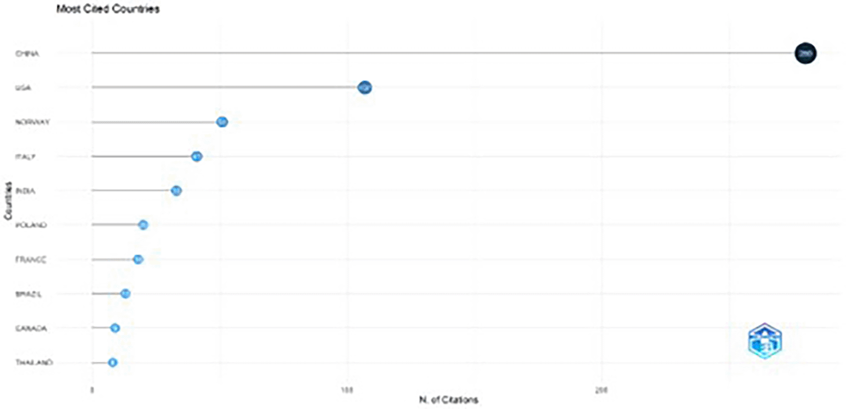 The line graph illustrates the post-article production trends covering citations. As shown in Figure 6, China had 280 citations, immediately followed by the USA with 107 citations. Norway ranks second with 51 citations, and Italy ranks fourth with 41 citations. Other countries, such as India (33), Poland (20), and France (18), show comparatively few citations. A possible reason for the low citation rates of papers from a few countries is a lack of confidence among readers.69