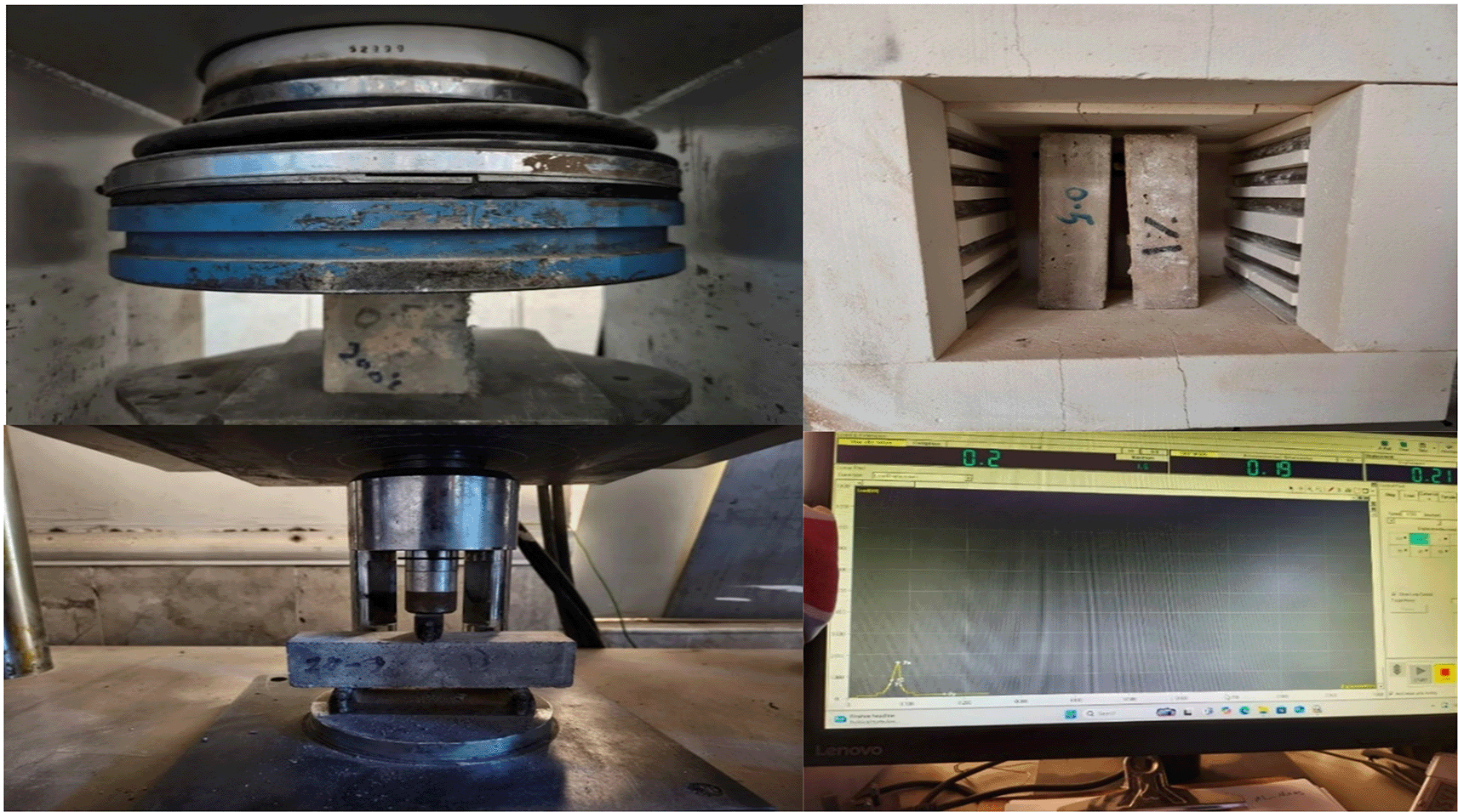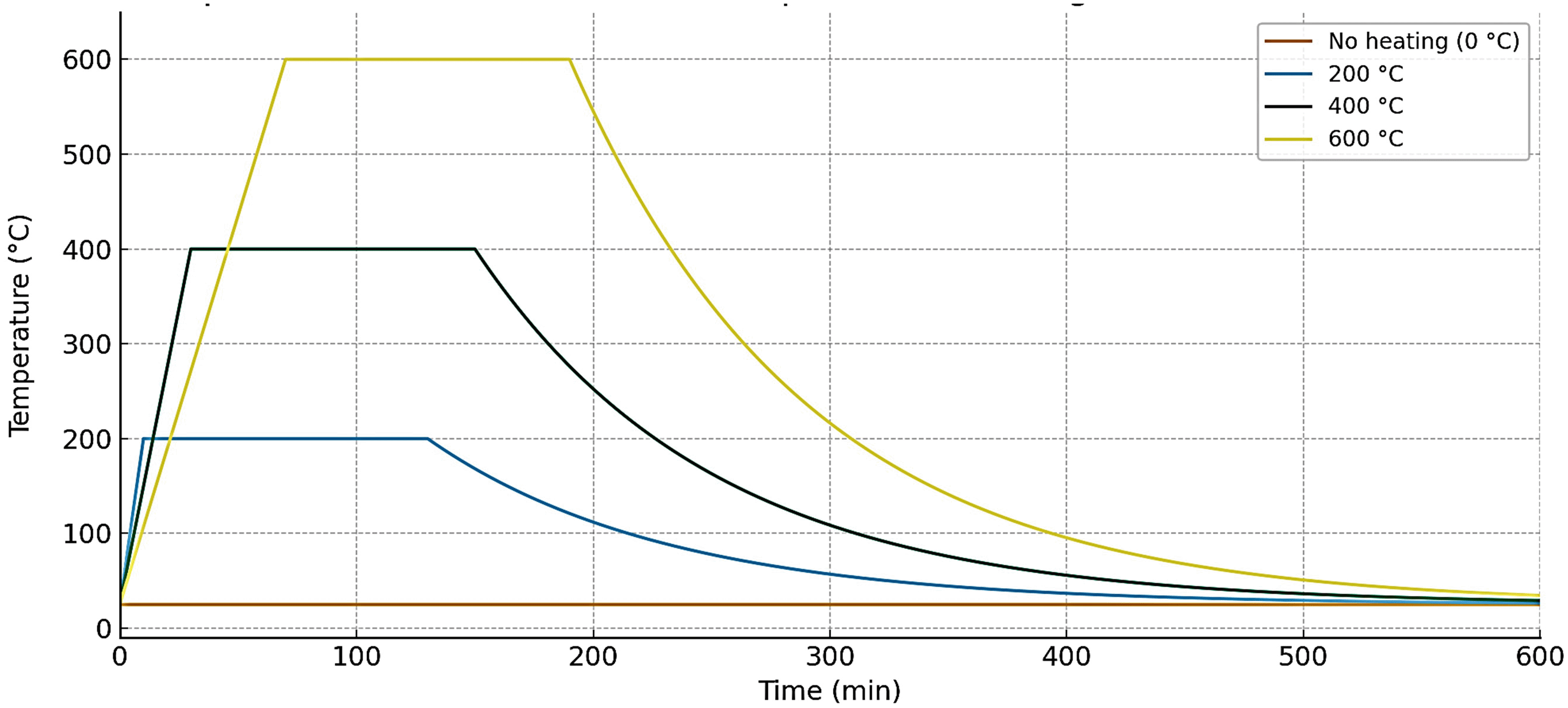 Flow Table Test was made according to ASTM C1437.22 The lubricated flow mold was placed at the center of the table and filled with fresh mortar in two layers. The mold was lifted vertically after 15 seconds. The table was dropped 25 times in 15 seconds. The final spread diameter was measured along two perpendicular axes and averaged. Compressive and flexural strength were measured according to ASTM C10923 and ASTM C348,24 respectively. Compressive strength was measured on three 50 × 50 × 50 mm cubes for each mix, using a 3000 kN compression machine. Load was applied continuously at 2400 ± 200 N/s until failure. The maximum load was recorded, and compressive strength was calculated. Three cubes were tested for each mix and averaged value have been adopted. Flexural strength was evaluated using three 50 × 50 × 160 mm prisms for each mix, under three-point loading. The prism was positioned with 100 mm clear span. Load was applied at 50 ± 10 N/s through third-point loading. Peak load at failure was recorded, and flexural strength was calculated. Load–deflection behavior was measured during flexural testing to evaluate post-cracking response and toughness. Dry density residual % was calculated as the percentage reduction in specimen mass after thermal exposure, the average of results of three specimens has been adopted, Figure 1 shows the tests that have been made in this study. Concrete specimens were exposed to elevated temperatures of 200, 400, and 600°C in an electric furnace, see Figure 2, in accordance with ISO 83425 and EN 1363-126 fire testing requirements. Heating was applied at a controlled rate of approximately 5°C/min until the designated target temperature was reached. Figure 3 shows the temperature–time profile followed during the heating and cooling stages of the thermal exposure process. This figure is essential because it shows that the heating rate, target temperatures, and cooling regime strictly followed the ISO 834 standard fire curve, as required in international fire-resistance testing.25,26 Each target temperature was maintained under isothermal conditions for a duration of 2 h to ensure thermal equilibrium throughout the specimens. Following the heating stage, the furnace was switched off and the specimens were subjected to natural cooling inside the furnace chamber under ambient laboratory conditions, simulating the post-fire cooling regime recommended in the standard. The cooling process followed the characteristic nonlinear decay prescribed by ISO 834, whereby the temperature decreases progressively toward ambient at a diminishing rate, thereby reproducing realistic post-fire exposure conditions.