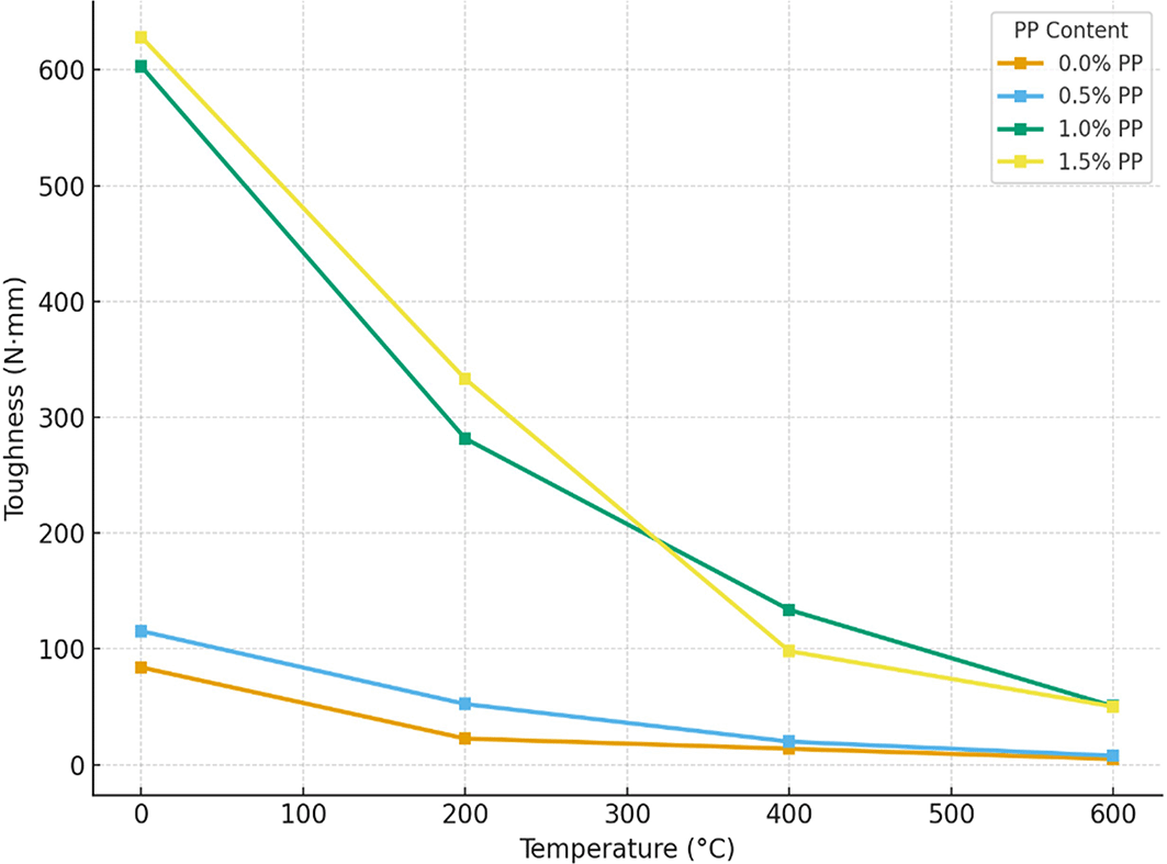 7. Flexural toughness improved markedly due to fiber bridging. At 600°C, the 1.5% PP mix retained toughness values nearly 10 times higher than the control, confirming substantial enhancement in post-cracking energy absorption.