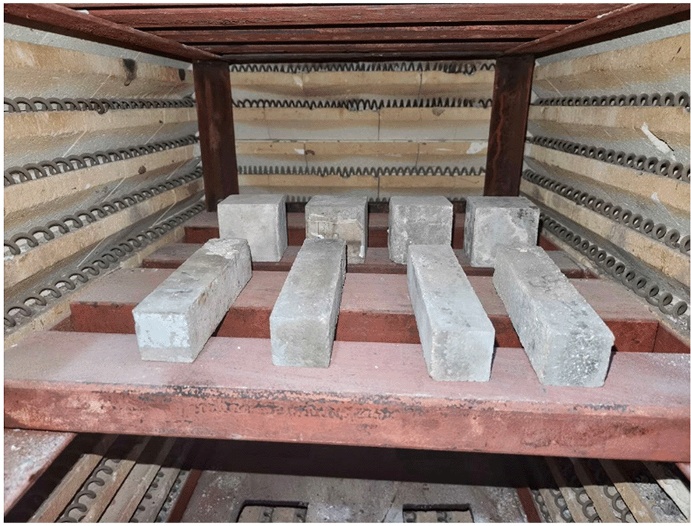 Dry materials (cement, sand, fibers) were mixed before adding water gradually. Fresh mortar was cast into molds, compacted in two layers, and surface finished. Specimens were demolded after 24 hours and cured in water at 20 ± 2°C until the age of 28 days. Prior to thermal exposure, all specimens were oven-dried at 105°C for 24 hours to remove free water and minimize explosive spalling risk.