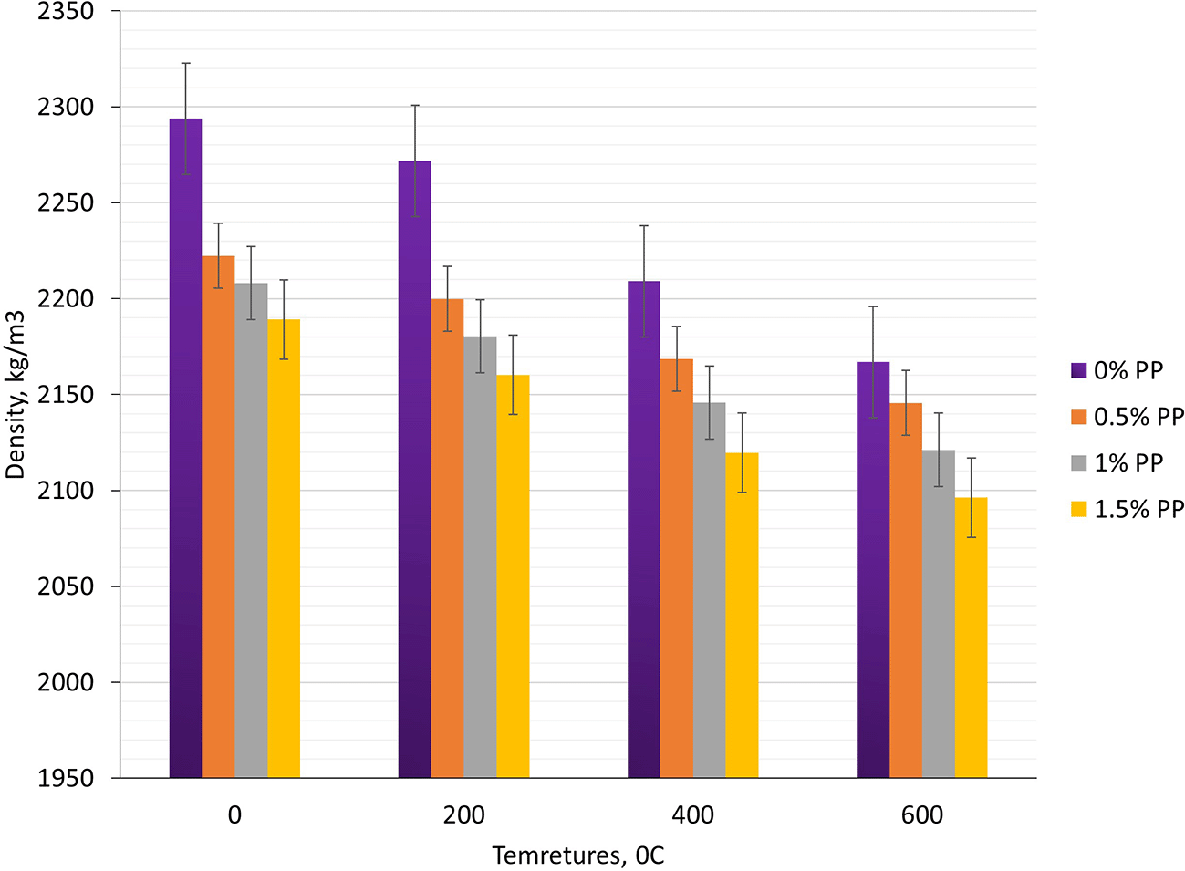 2. All mixtures retained above 94% of their original density at 600°C. The control mix kept 94.5%, whereas PP fiber mixes retained slightly higher values (96.0–96.5%), confirming that melted fibers help limit microcrack propagation.