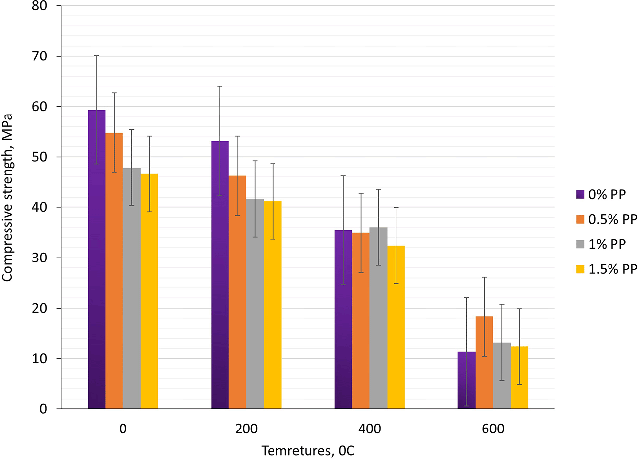 The Figures 6, 7 and Table 3 reports compressive strength for mixtures with 0, 0.5, 1.0 and 1.5% PP fibers after exposure to 0, 200, 400 and 600°C with Residual Strength (%).