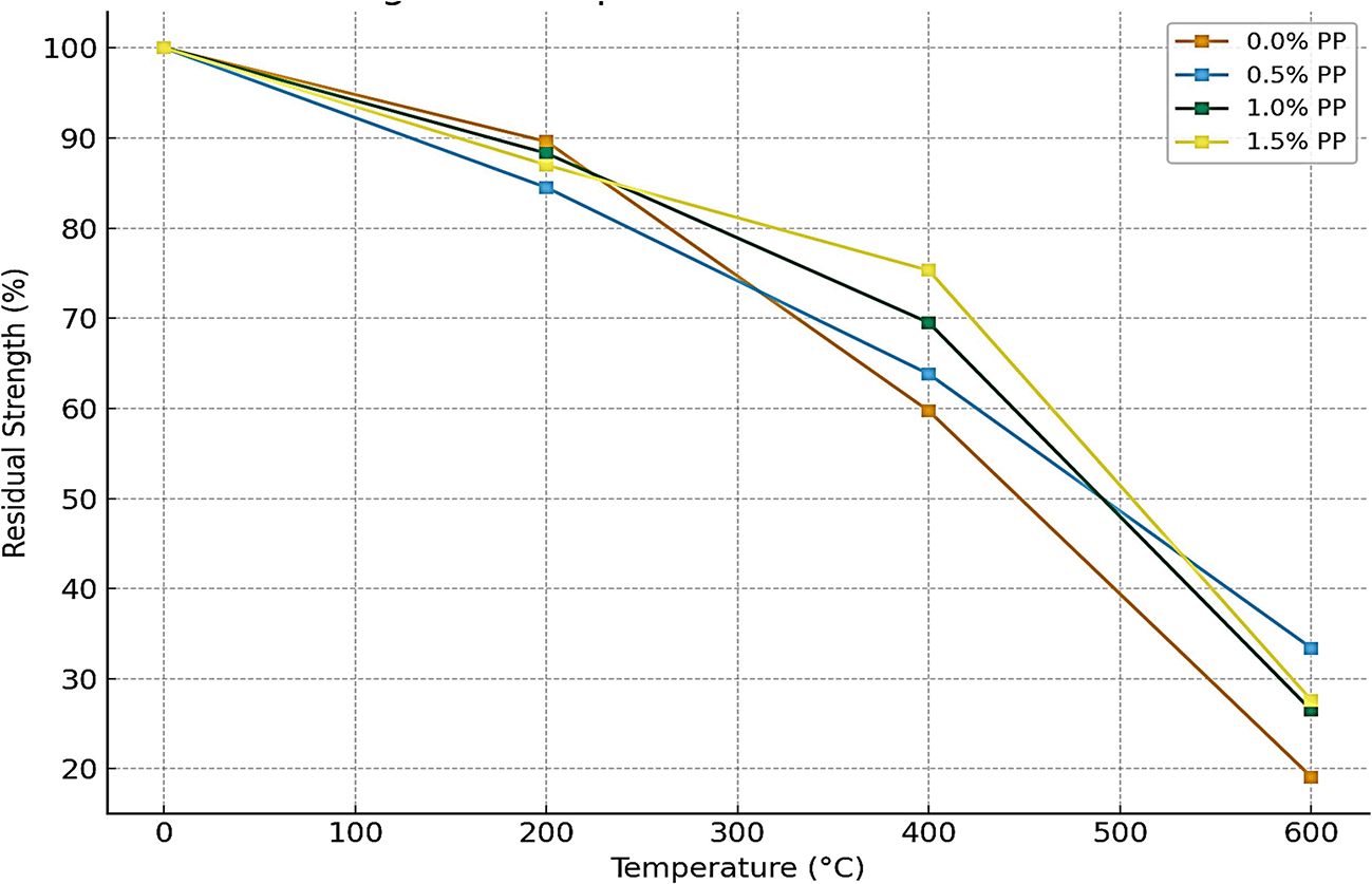 Husem6 found residual strength of 20–22% for mortar at 600°C, while Alvarez et al.15 found 30–35% residual strength for PP-reinforced mortar. Shahriar et al.16 found 32–36% residual strength at 600°C for PP-fiber concrete.