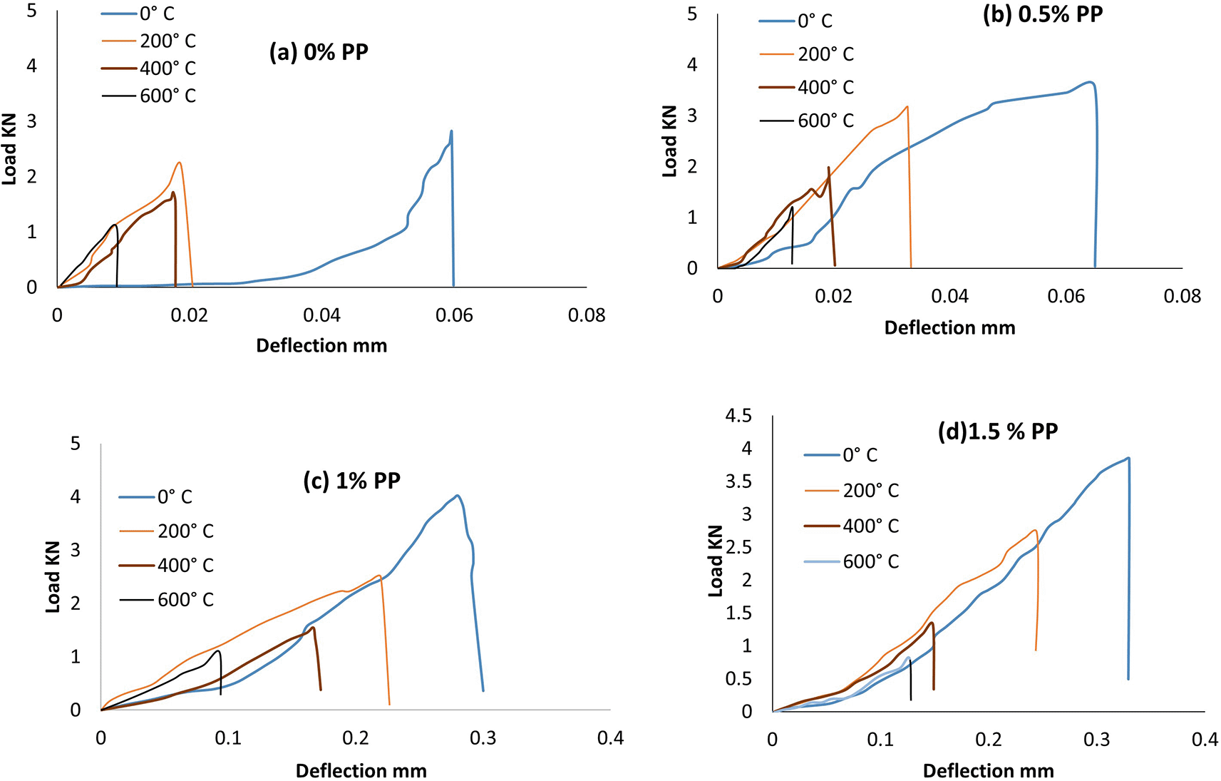 Both the ultimate load-carrying capacity (Pmax) and the deflection at failure (Δ) are clearly impacted by the PP fiber content and exposure temperature, according to the findings of the flexural tests shown in Figure 8 and Table 4. Flexural strength and ductility were significantly reduced (Δ dropped from 0.0600 mm to 0.0068 mm) in the fiber-free reference mix, which showed a steady decrease in Pmax from 2.80 kN at room temperature to 1.09 kN at 600°C. At all temperature settings, the addition of PP fibers improved the deformation capacity and load resistance. The blend with 0.5% PP fibers demonstrated better thermal stability by achieving a greater initial load capacity of 3.55 kN and maintaining 3.17 kN at 200°C.