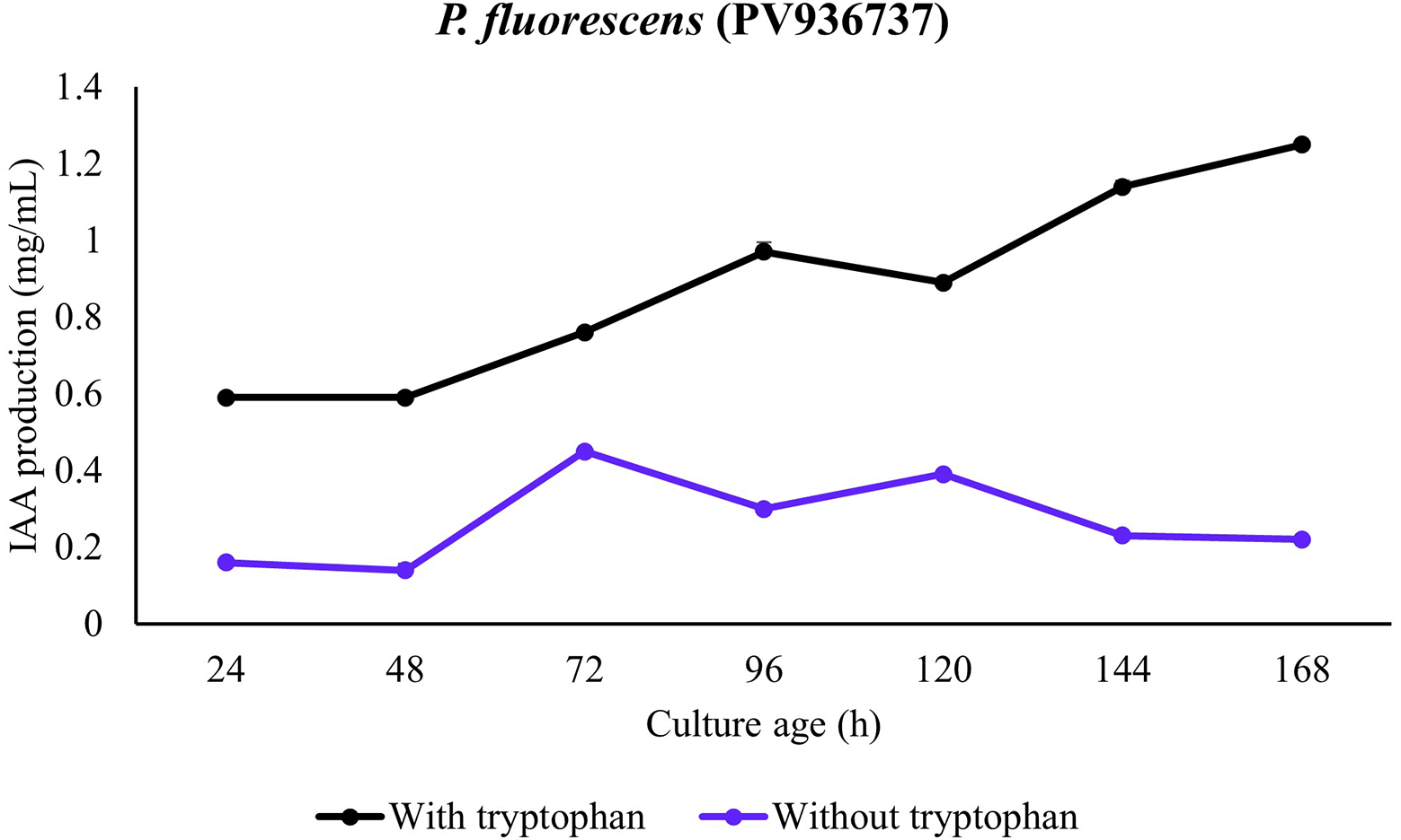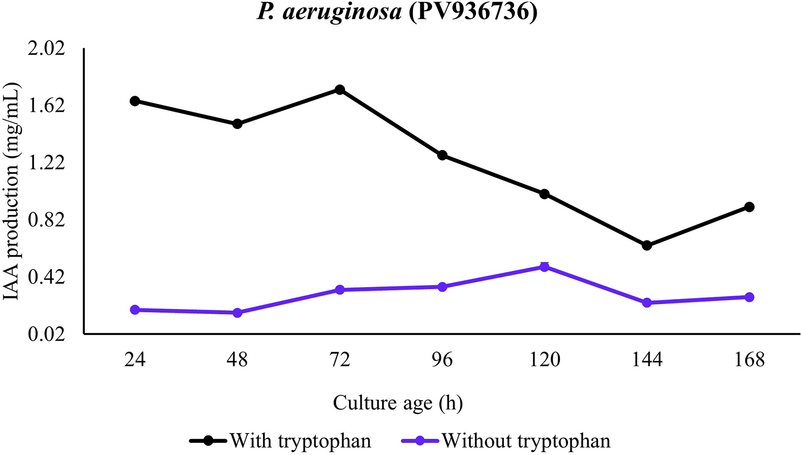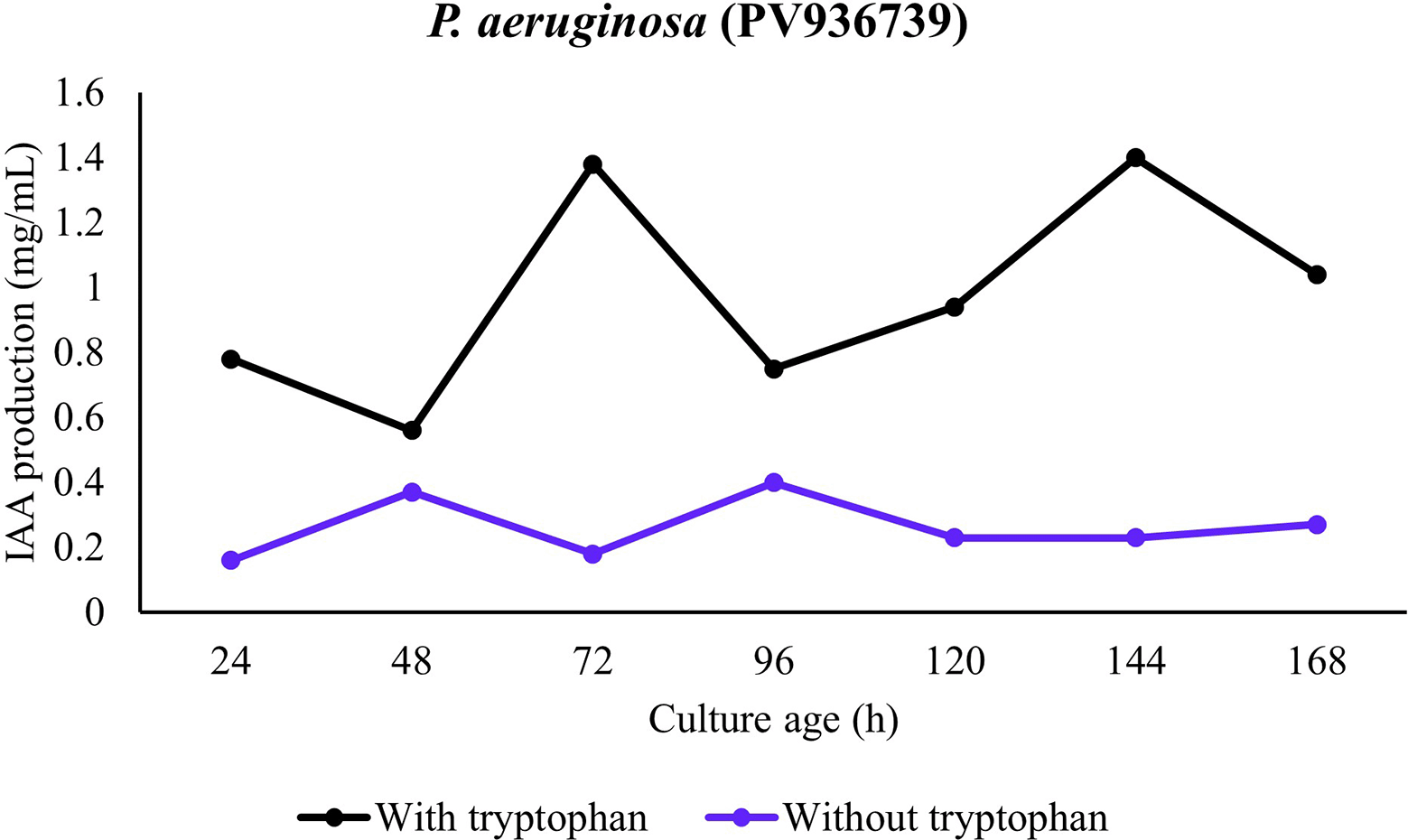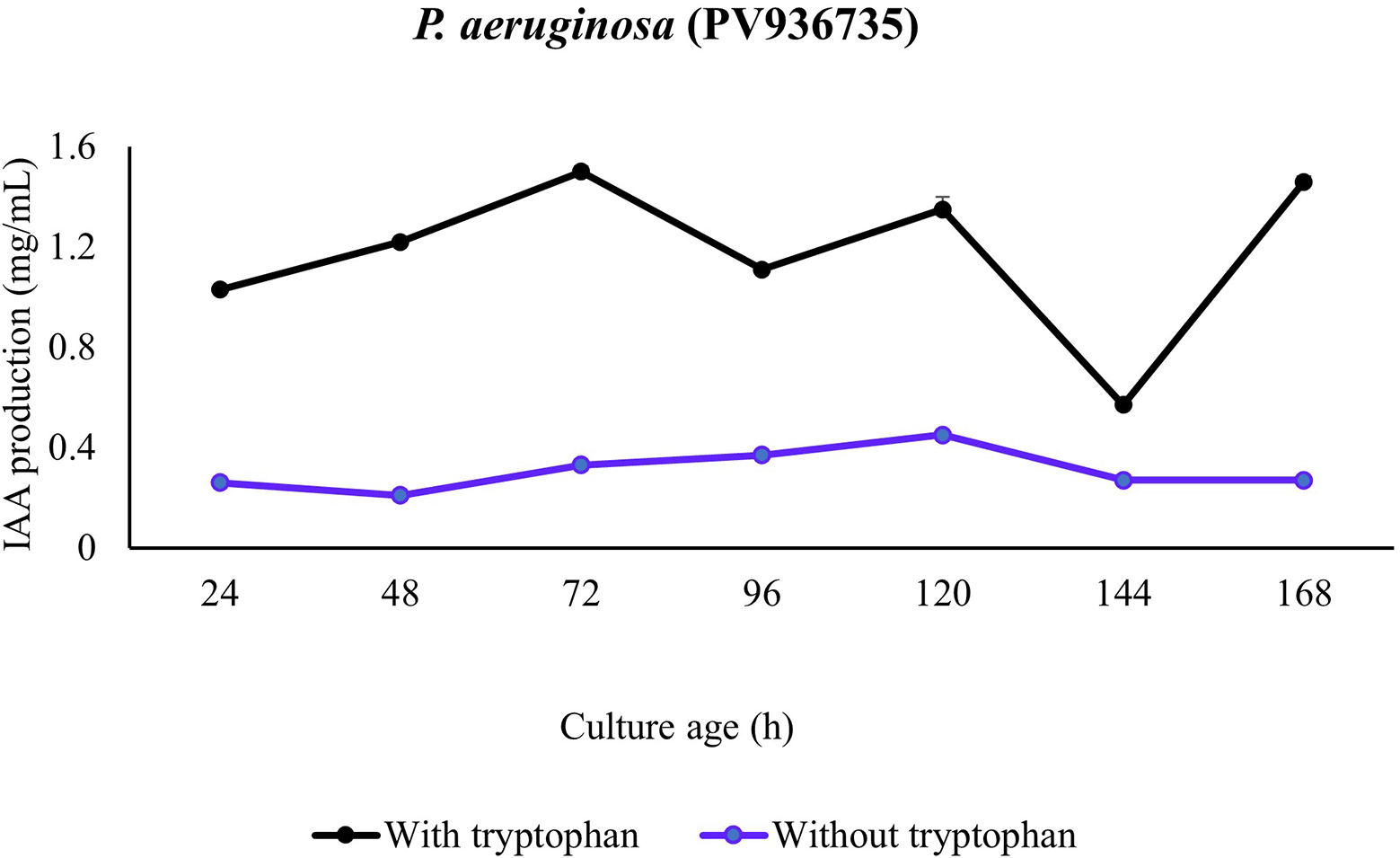 For P. aeruginosa (PV936735), IAA production in the presence of tryptophan showed consistent increase from low level during initial growth to peak level at late log/early stationary phase. Indole acetic acid concentration during initial growth phase. A similar pattern was followed in the absence of tryptophan, although values were significantly lower than for tryptophan-supplemented culture (Figure 1).