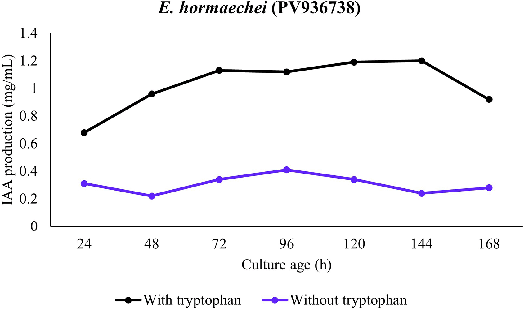 Enterobacter hormaechei was examined as plant growth-promoting bacteria with IAA-producing potential for improvement in the growth of Lycopersicum esculentum in a study by Ranawat et al., (2021). Indole acetic acid production in presence of Enterobacter hormaechei (PV936738) revealed remarkable increase from late-log to highest concentration in stationary phase.