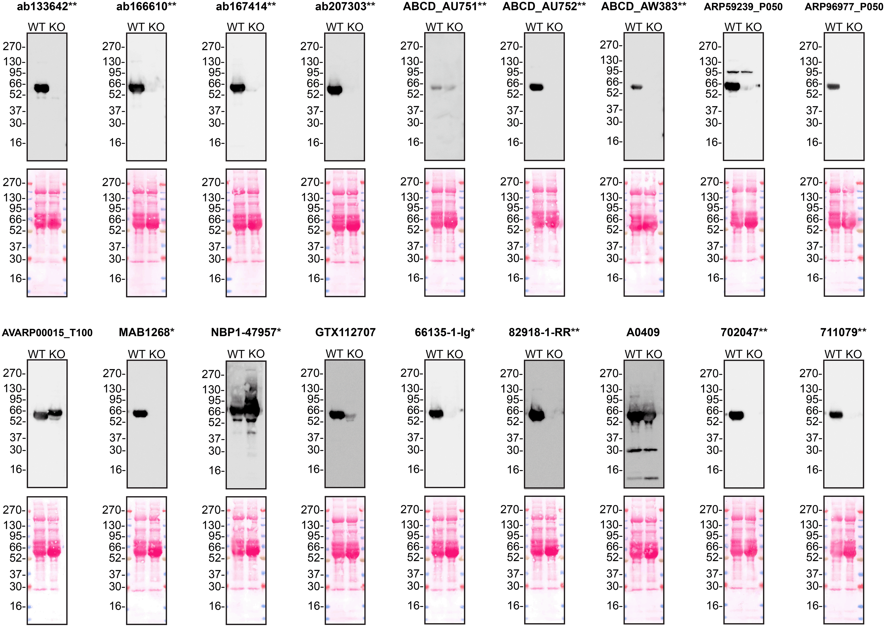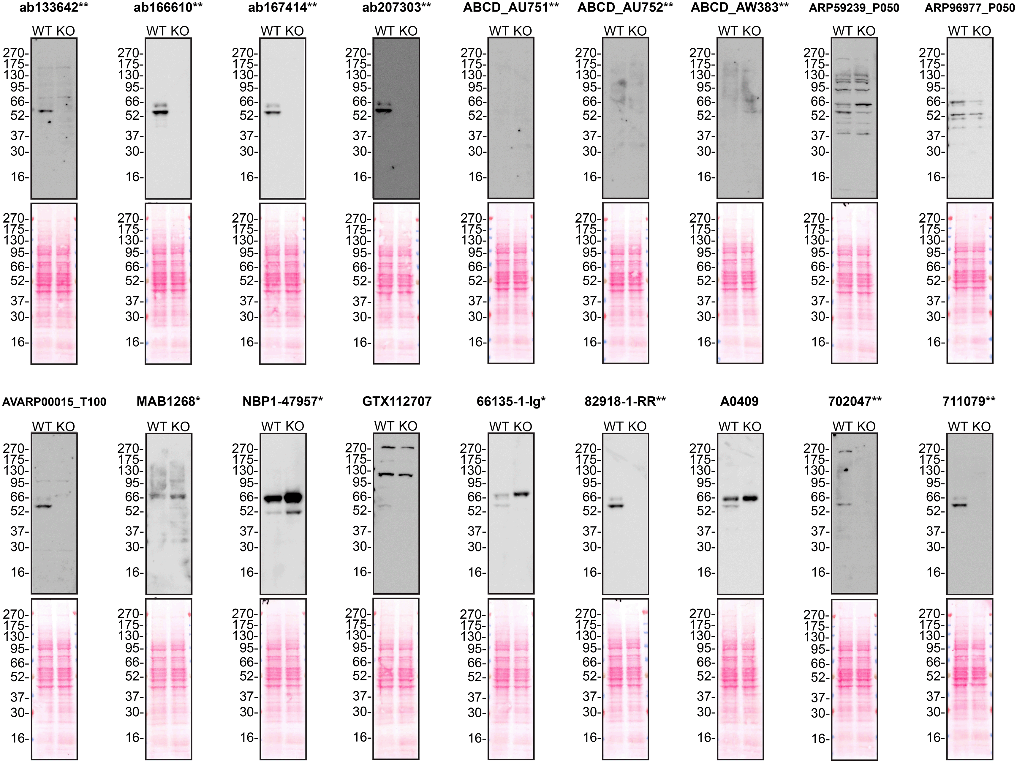 Protein lysates from Hep G2 WT and SERPINA1 KO cells were collected, and 30μg of protein was used for western blot with the indicated Alpha-1-antitrypsin antibodies. The Ponceau stained transfers of each blot are presented to show equal loading of WT and KO samples. Antibody dilutions were chosen according to the recommendations of the antibody supplier. Antibody dilutions used: ab133642** at 1/1000, ab166610** at 1/1000, ab167414** at 1/1000, ab207303** at 1 in 5000, ABCD_AU751** at 1/5, ABCD_AU752** at 1/85, ABCD_AW383** at 1/35, ARP59239_P050 at 1/500, ARP96977_P050 at 1/500, AVARP00015_T100 at 1/800, MAB1268* at 1/500, NBP1-47957* at 1/1000, GTX112707 at 1/3000, 66135-1-Ig* at 1/5000, 82918-1-RR** at 1/2000, A0409 at 1/15000, 702047** at 1/500 and 711079** at 1/500. Predicted band size: 46.7 kDa. *Monoclonal antibody; **Recombinant antibody.