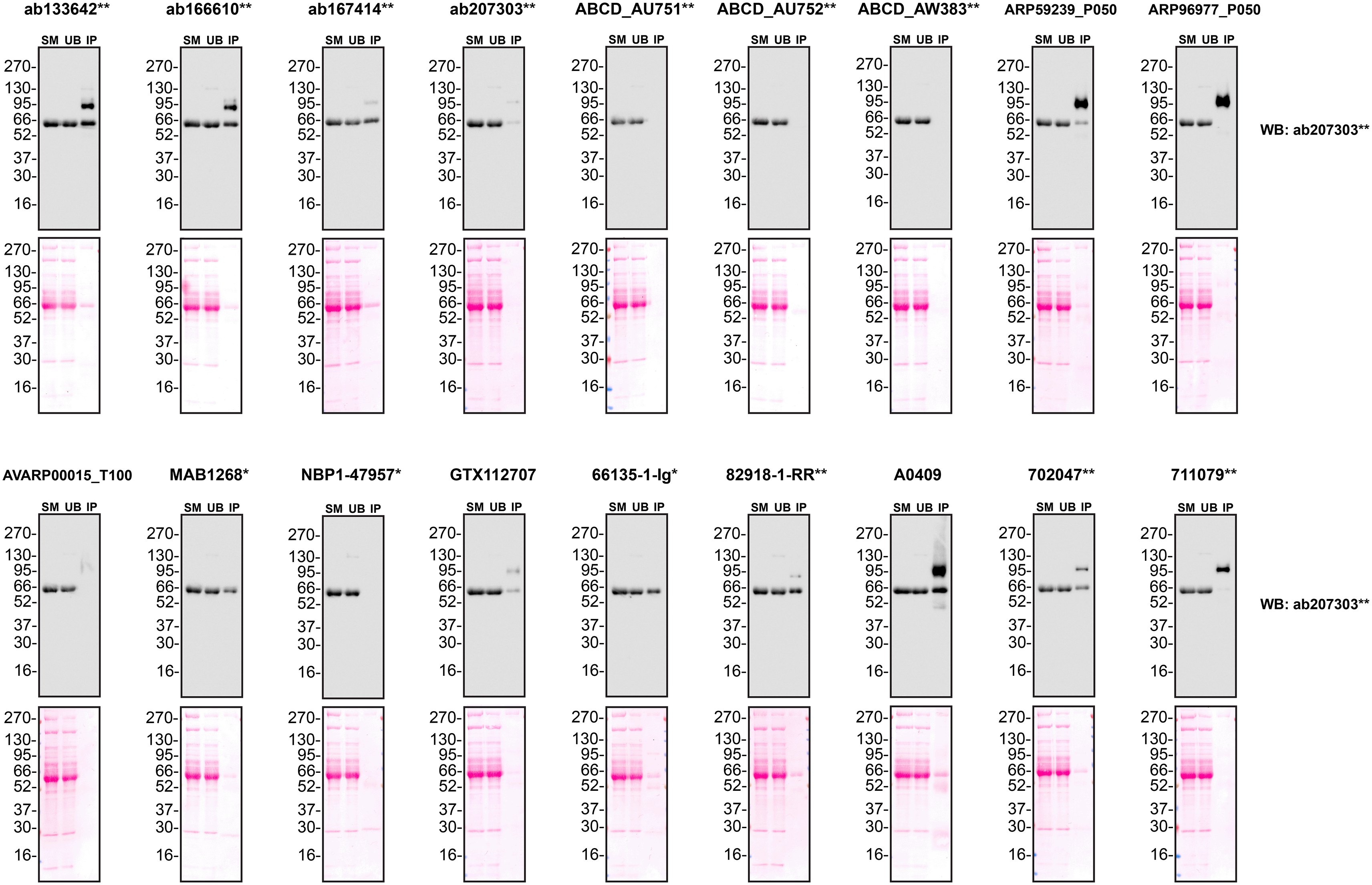 Conditioned culture medium was collected from Hep G2 WT cells, and immunoprecipitation was performed for 18 hours using 0.5 mg of protein and 2.0 μg of the indicated Alpha-1-antitrypsin antibodies pre-coupled to Dynabeads protein A or protein G. Samples were washed and processed for western blot with the anti- Alpha-1-antitrypsin antibody ab207303** diluted at 1/5000. The Ponceau stained transfers of each blot are shown. SM=4% starting material; UB = 4% unbound fraction; IP = immunoprecipitate. *Monoclonal antibody; **Recombinant antibody.