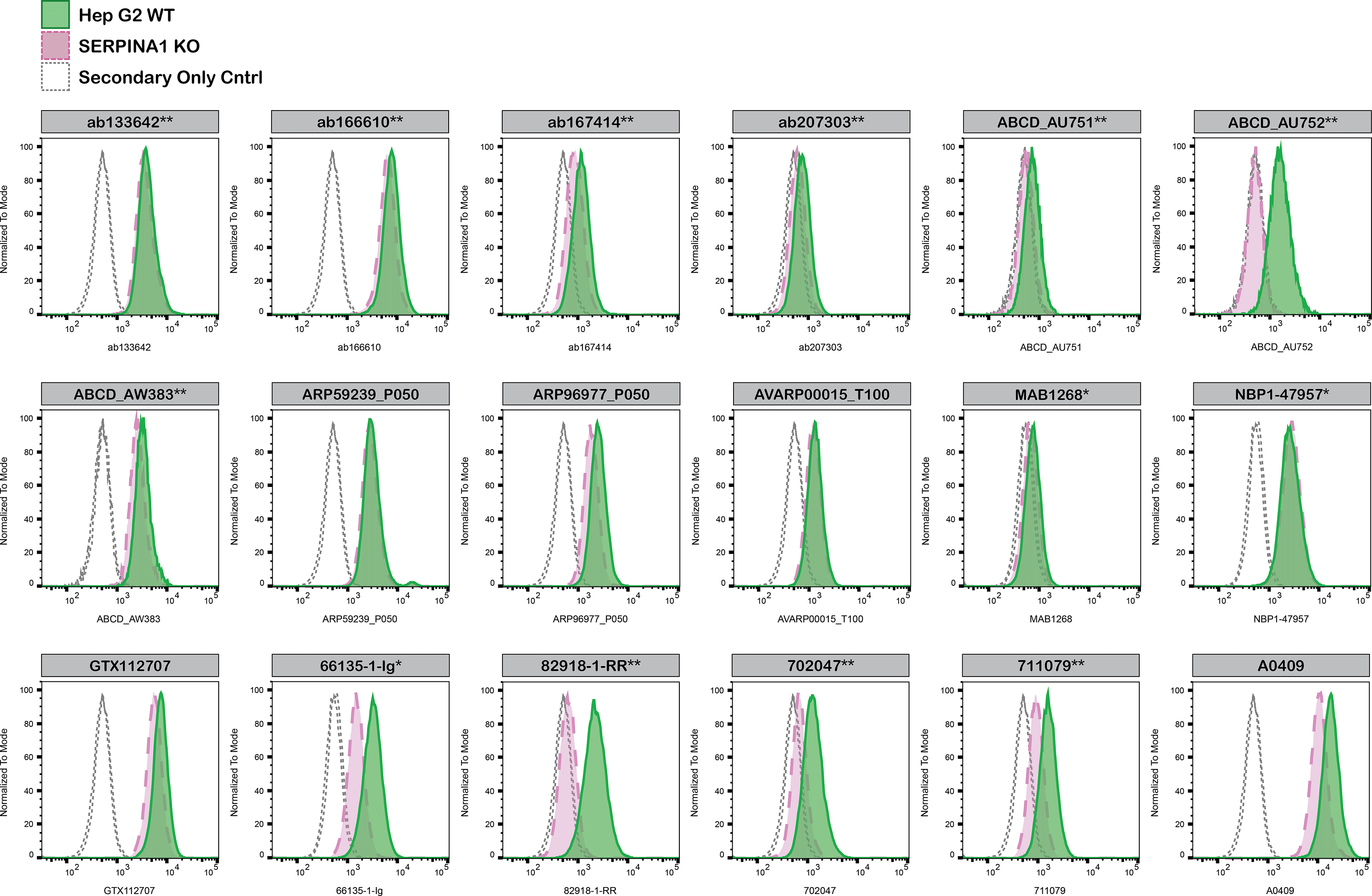Hep G2 WT and SERPINA1 KO cells were labelled with a green or violet, fluorescent dye, respectively. WT and KO cells were mixed in a 1:1 ratio, fixed in 4% PFA and permeabilized in 0.1% saponin. 400,000 cells were stained with the indicated alpha-1-antitrypsin antibodies and corresponding Multi-rAb CoraLite® Plus 647 secondary antibodies. Antibody staining was quantified using the Attune NxT Flow Cytometer with representative images showing the staining intensity in the KO population (pink histogram, dashed line) compared to the WT cells (green histogram, solid line). Histograms with dotted lines represent secondary antibody-only controls in both WT and KO cells. Antibody dilutions used: ab133642** at 1/1050, ab166610** at 1/237, ab167414** at 1/277, ab207303** at 1/999, ABCD_AU751**at 1/5, ABCD_AU752** at 1/850, ABCD_AW383** at 1/35, ARP59239_P050 at 1/5000, ARP96977_P050 at 1/5000, AVARP00015_T100 at 1/1000, MAB1268* at 1/500, NBP1-47957* at 1/100, GTX112707 at 1/810, 66135-1-Ig* at 1/1600, 82918-1-RR** at 1/8000, A0409 at 1/1000, 702047** at 1/500, 711079** at 1/500. *Monoclonal antibody; **Recombinant antibody.